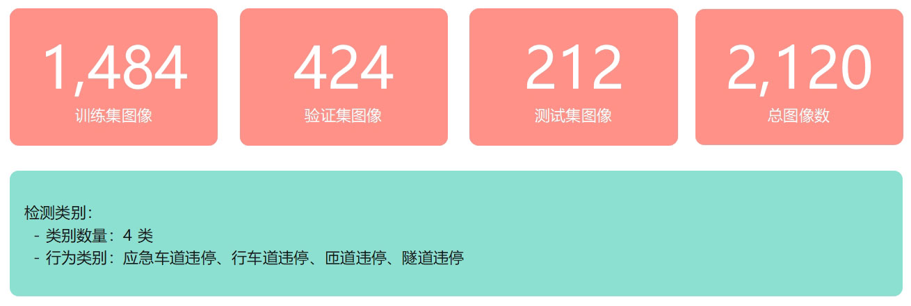 本研究使用的是高速公路违章停车检测数据集,该数据集专门针对高速公路场景中车辆的不同违停行为进行标注。数据集包含高速公路主线、应急车道、匝道、隧道等多种路段场景下的图像,涵盖不同光照条件、不同拍摄角度和交通密度,包含4个违章停车类别(应急车道违停、行车道违停、匝道违停、隧道违停),具有较强的场景多样性和实用价值。数据集共包含2,120张高质量标注图像(2,380个标注框),按照约7:2:1的比例划分为训练集(1,484张)、验证集(424张)和测试集(212张),为模型训练和评估提供了充足的数据支撑。