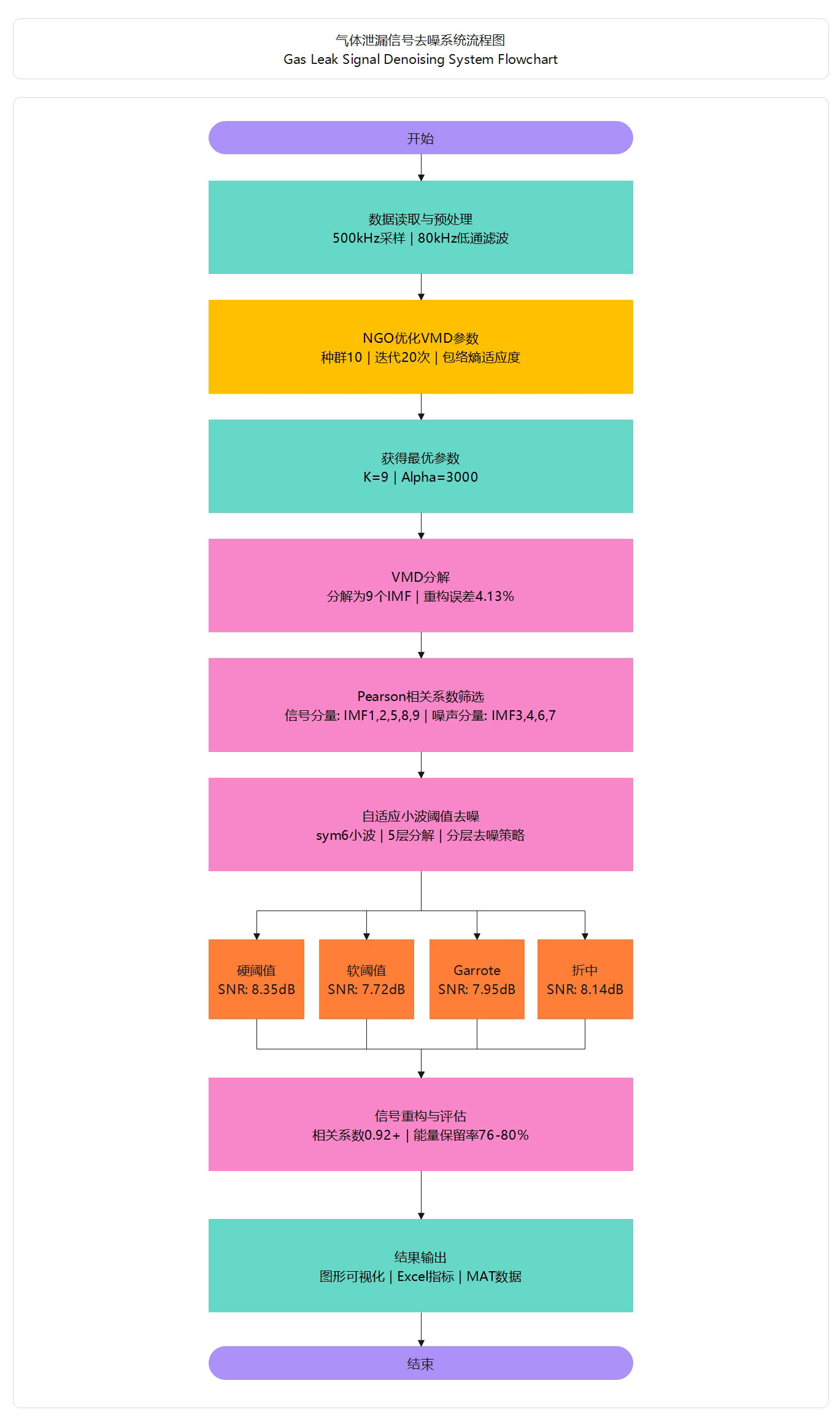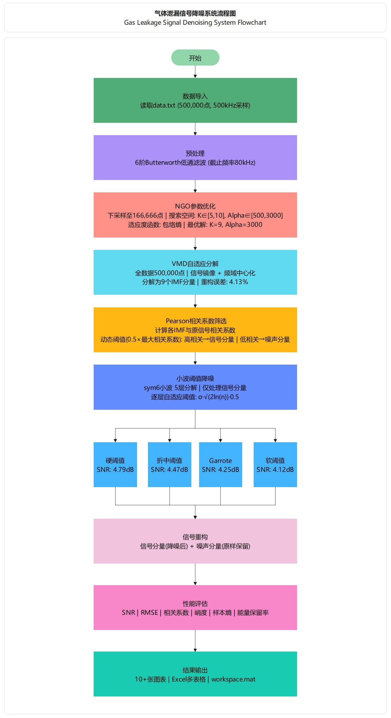 基于NGO优化算法、VMD自适应分解和小波阈值降噪的五级串行流水线架构。NGO算法智能搜索最优VMD参数实现自适应优化,VMD将气体泄漏信号分解为多个本征模态函数(IMF),Pearson相关系数智能区分信号与噪声分量,sym6小波5层分解对信号分量进行逐层自适应阈值降噪(硬/软/Garrote/折中四种方法),最终重构得到降噪信号。系统从SNR、RMSE、相关系数、峭度、样本熵、能量保留率六个维度进行IMF级和整体级双层性能评估,形成完整的气体泄漏信号降噪解决方案。