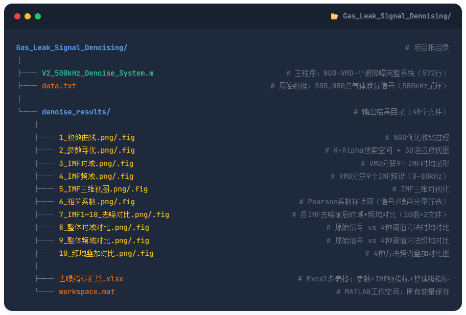 本项目基于NGO优化算法、VMD自适应分解和小波阈值降噪技术,构建了五级串行流水线架构的气体泄漏超声信号智能降噪系统,实现了VMD重构误差4.13%、整体SNR提升4.79dB的高效降噪效果,并输出19张可视化图表和Excel多维指标汇总,形成完整的信号处理解决方案。