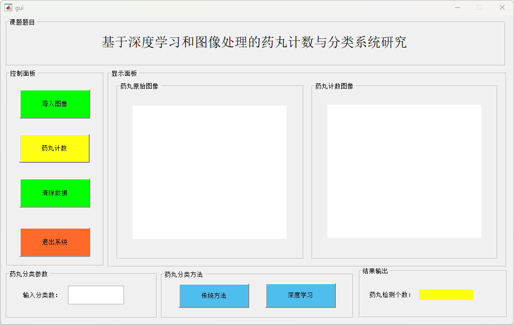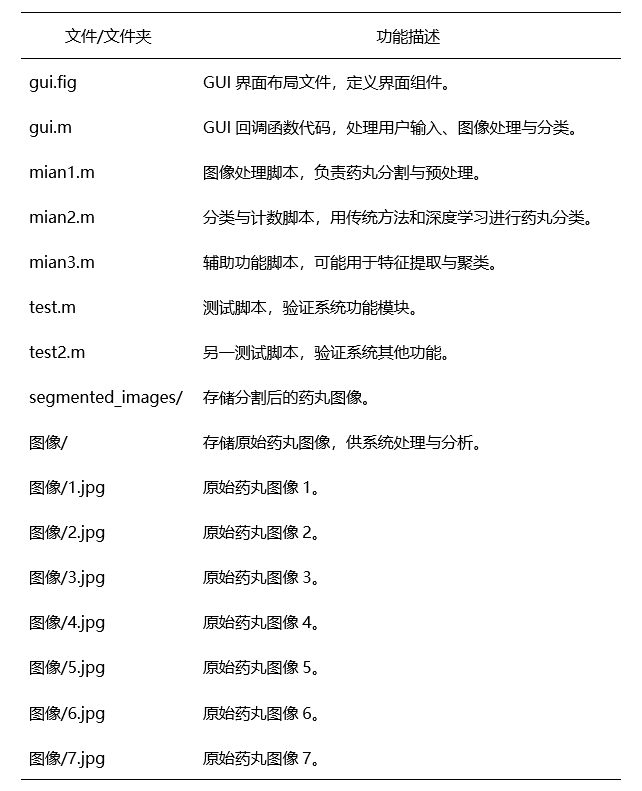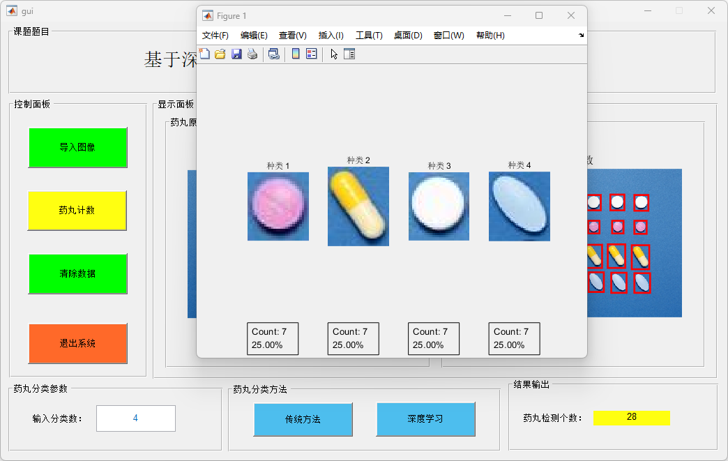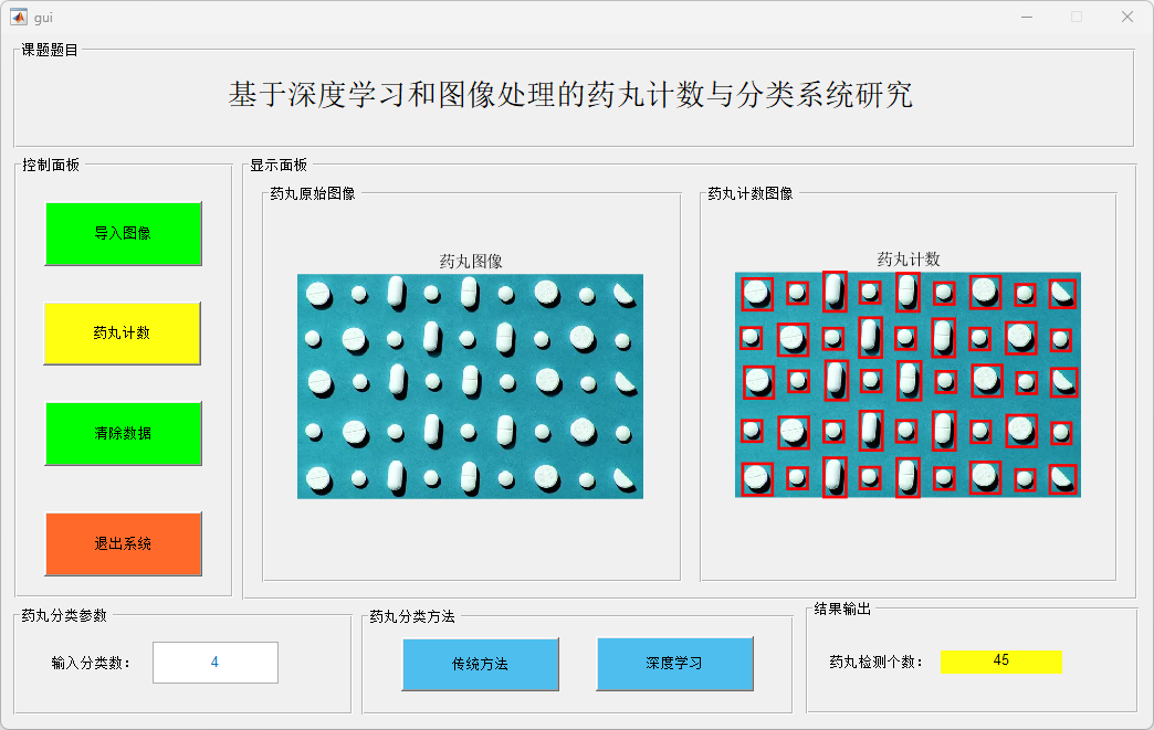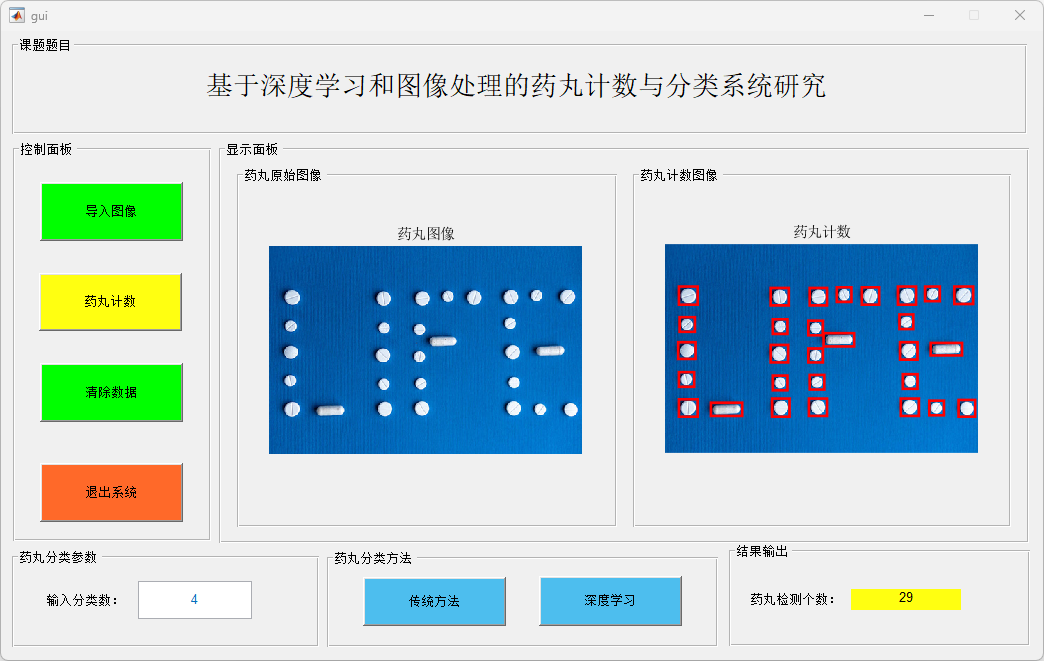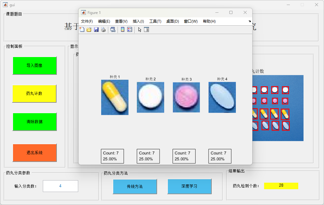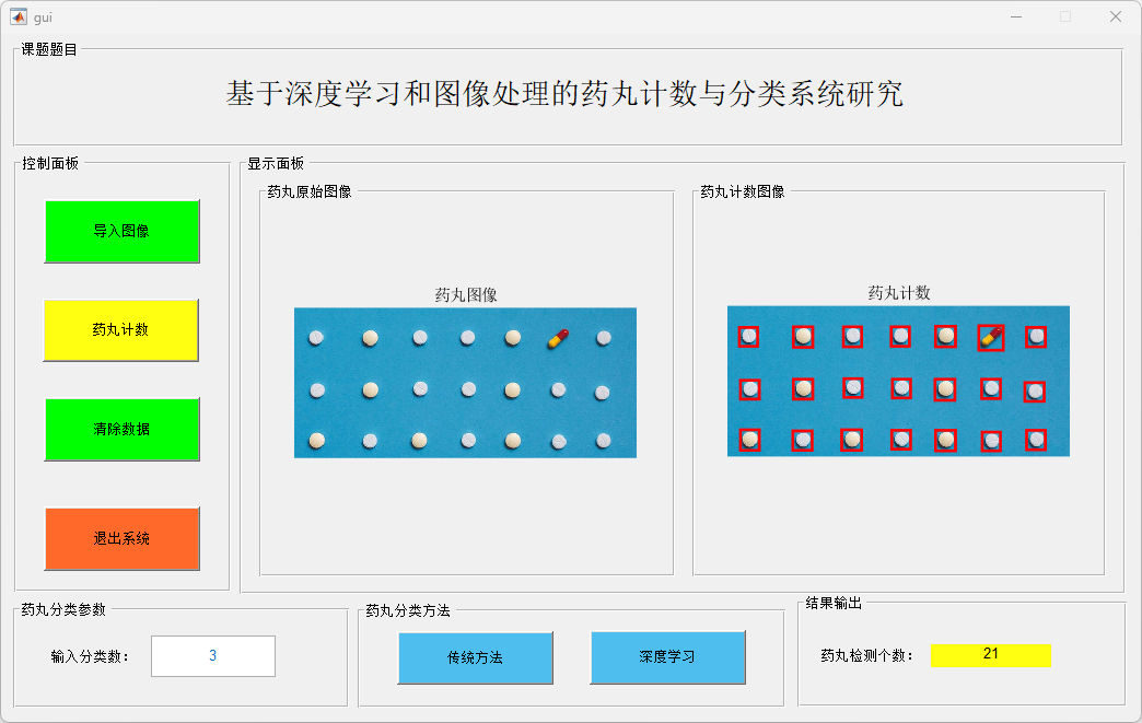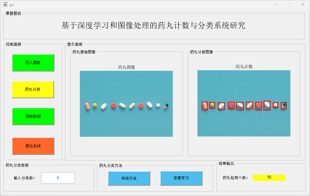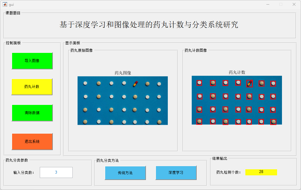 此外,本文基于 MATLAB GUIDE 构建了图形化用户界面,集成图像加载、预处理、药丸分割与显示、计数统计、传统特征分类与深度学习特征分类等功能,实现了系统的可视化操作与便捷调用。实验结果验证了该系统在药丸图像自动处理、数量统计以及基于特征的分类任务中的有效性与实用性。
