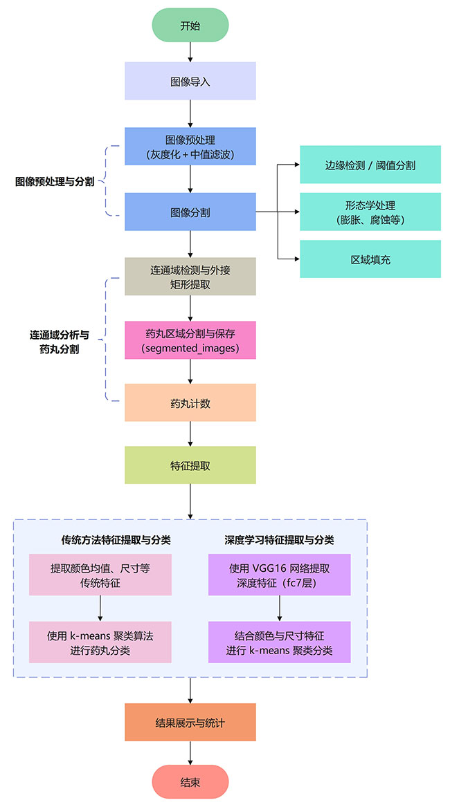 本系统采用“图像预处理+药丸分割计数+特征提取与聚类分类+MATLAB GUI 可视化”的整体架构,实现了药丸图像的自动检测、计数与分类一体化处理。