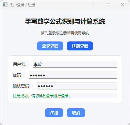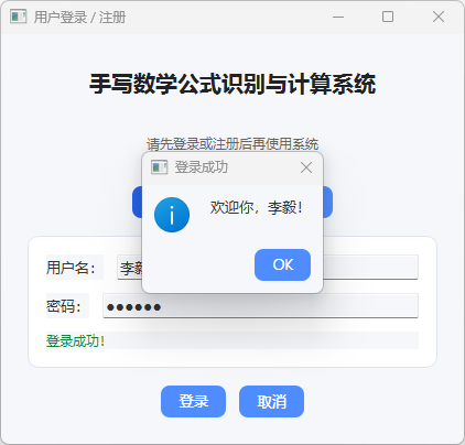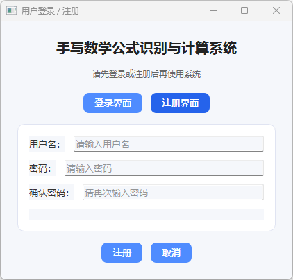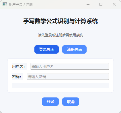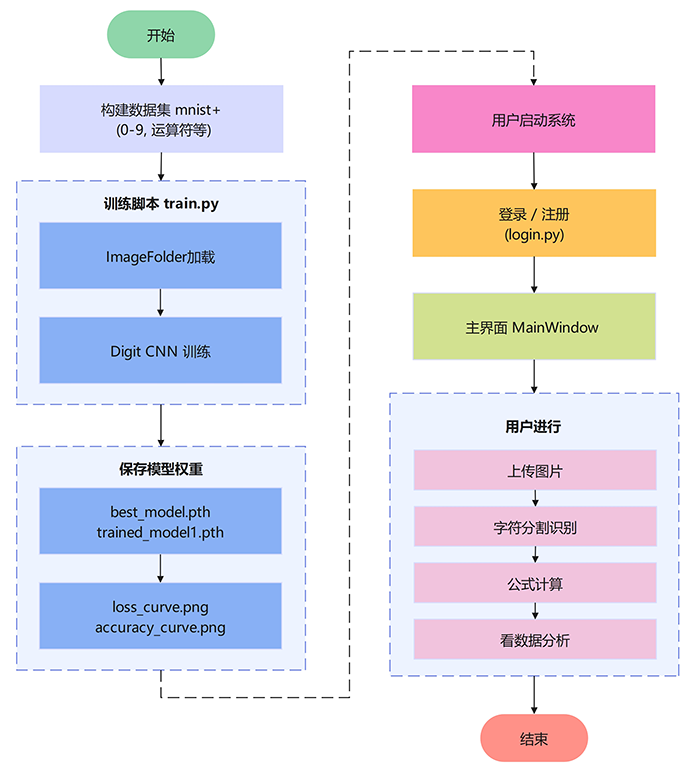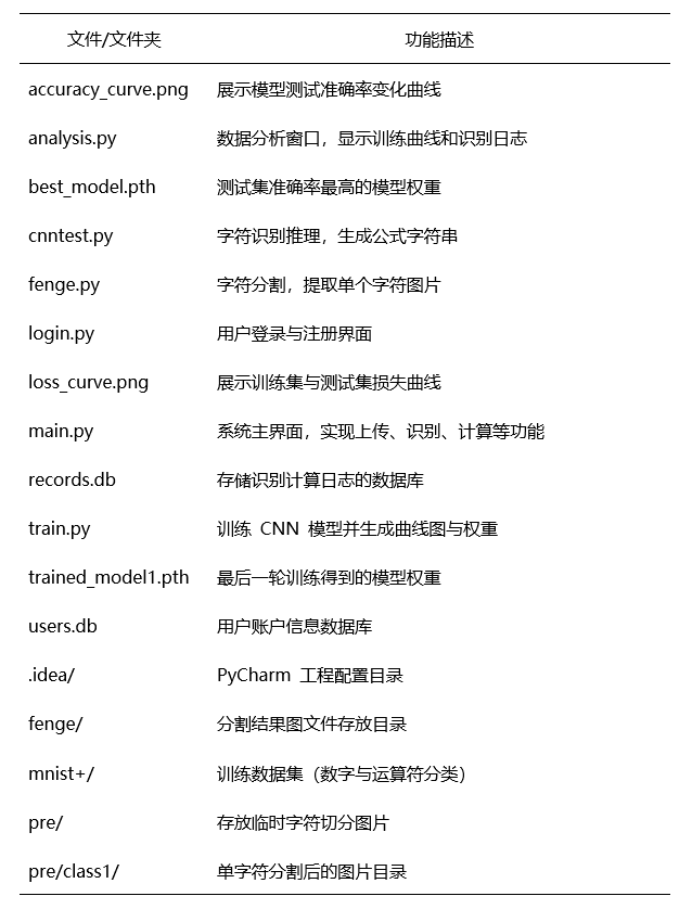 在方法层面,系统采用自构建的“mnist+”字符数据集,利用卷积神经网络(CNN)构建字符分类模型,并结合图像预处理与字符分割算法,实现对整张手写公式图像的自动拆分与识别。首先,通过灰度化、二值化、形态学开运算与轮廓分析,对输入图像进行字符级分割;随后,利用自定义 CNN 模型对单字符进行分类识别,并按从左到右顺序拼接生成可计算的数学表达式。为保证表达式计算过程的安全性与可靠性,系统引入基于正则校验的安全求值(safe eval)机制,仅允许数字、四则运算符及有限括号结构参与计算。在系统实现层面,本文基于 PyQt5 构建图形化用户界面,实现了公式图片上传、字符分割结果可视化展示、识别结果与计算结果显示、用户登录与权限管理以及识别日志记录等功能,并利用 SQLite 数据库对用户信息与检测记录进行持久化存储,同时提供训练损失曲线、准确率曲线与识别日志的可视化分析界面。