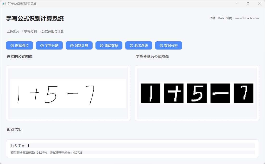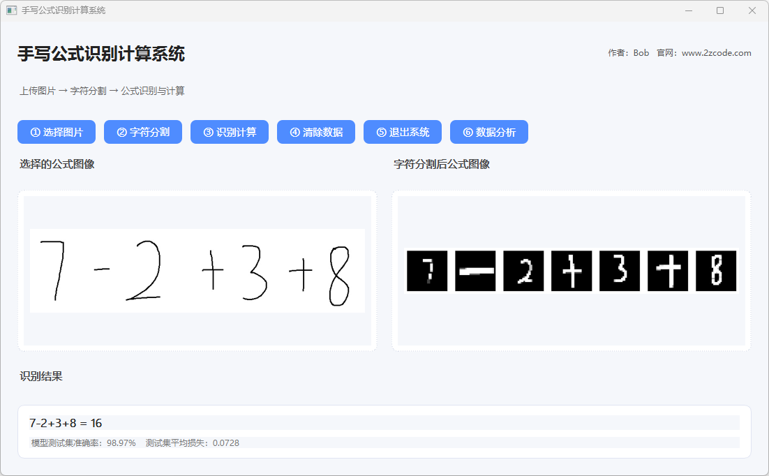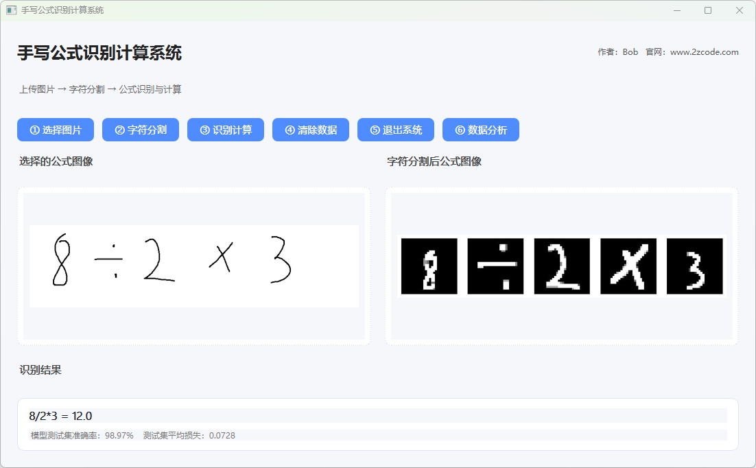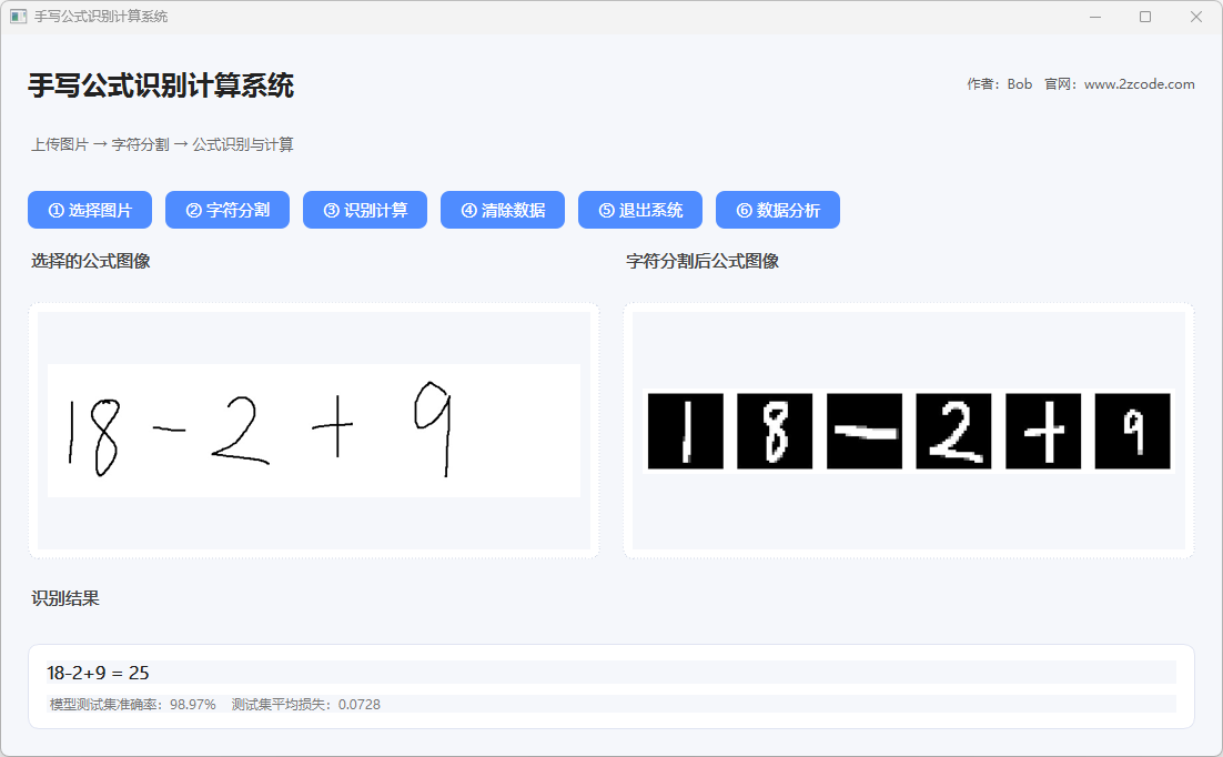 本系统采用模块化设计思想,基于深度学习字符识别、图像分割处理与图形化界面交互,实现了手写数学公式的自动识别、计算与数据分析功能。