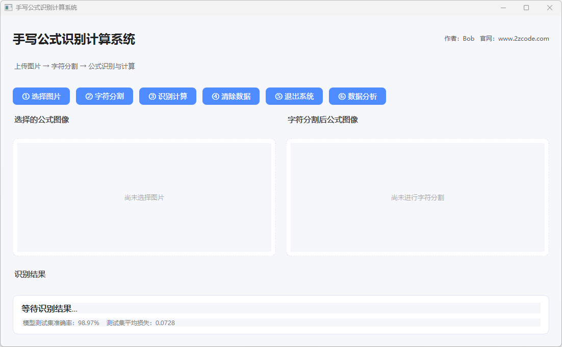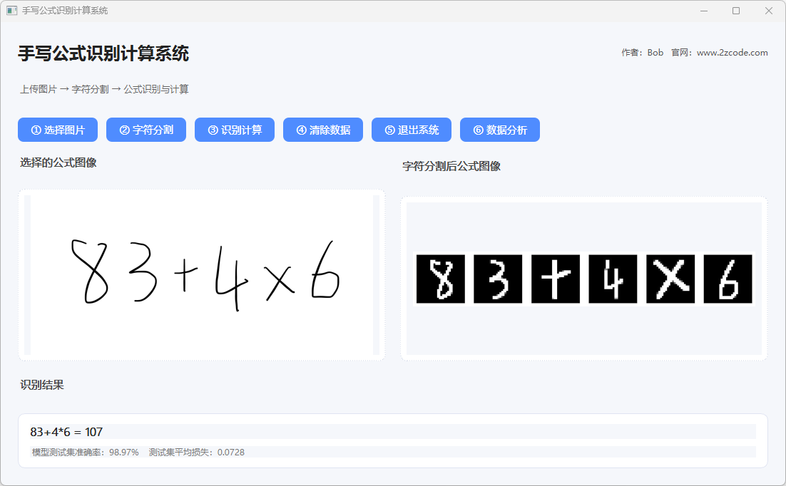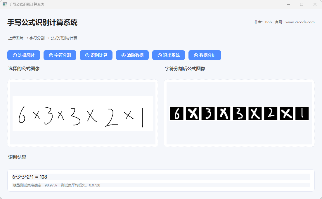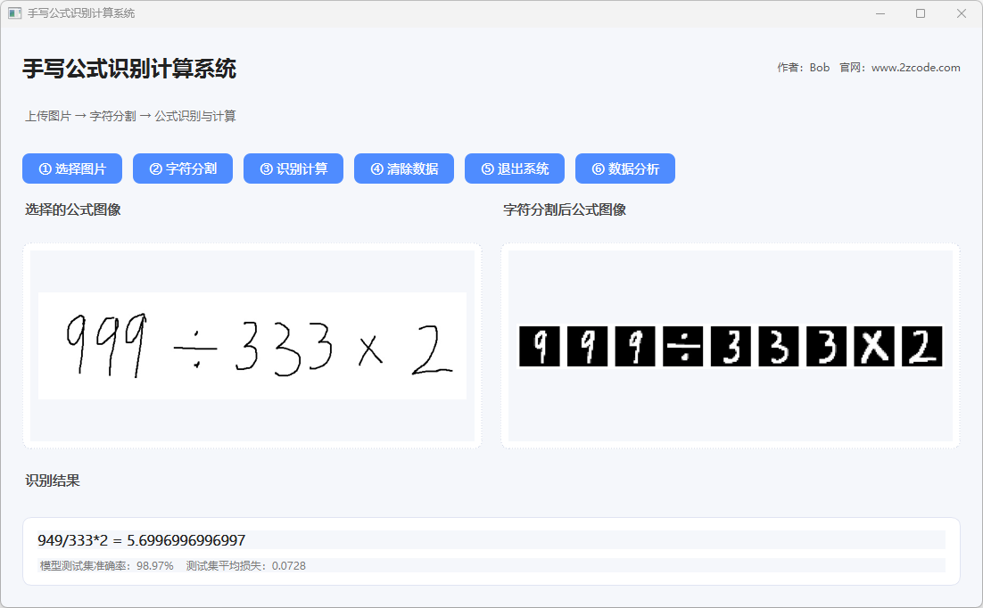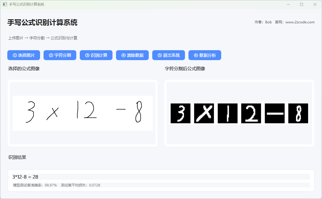 本系统采用模块化设计思想,基于深度学习字符识别、图像分割处理与图形化界面交互,实现了手写数学公式的自动识别、计算与数据分析功能。