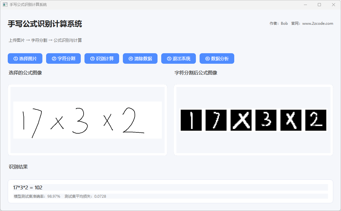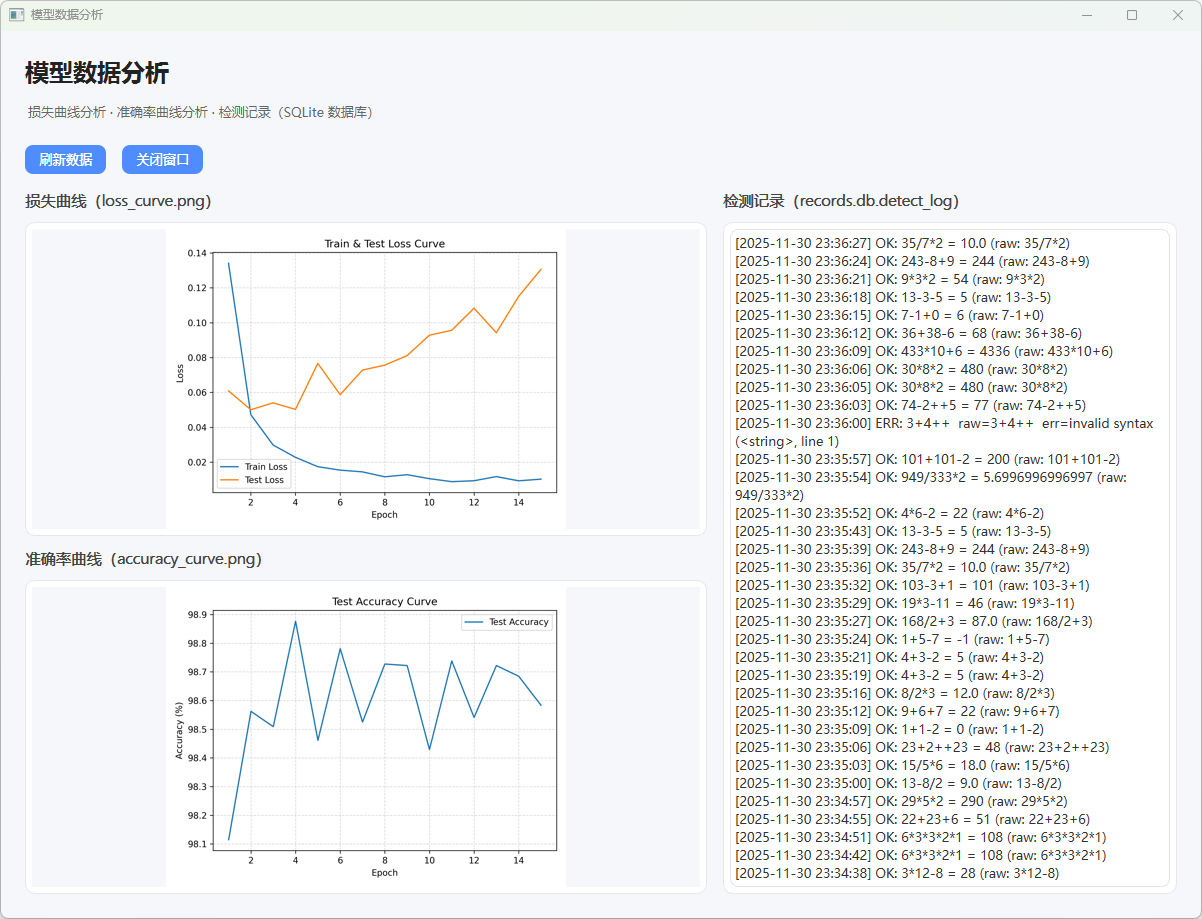 实验结果表明,所构建的字符识别模型在测试集上取得了 98% 以上的平均识别准确率,系统能够稳定、准确地识别常见数字及基本算符,并完成对应算式的自动计算,基本满足日常手写公式识别与计算的应用需求。该系统整体结构清晰、模块划分合理、易于扩展,可在此基础上进一步支持更复杂的数学符号体系、公式排版解析以及作业批改与智能教学等应用场景,为手写数学表达式的智能识别与人机交互提供了一种可行解决方案。
