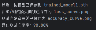 展示了模型训练过程中的日志输出信息,包括最佳模型的保存提示、训练/测试损失曲线与测试准确率曲线的文件保存路径,以及最终达到的测试集最佳准确率(98.88%)。日志清晰反映了训练脚本的执行流程和模型性能收敛情况,为后续可视化分析和模型比较提供了基础数据。