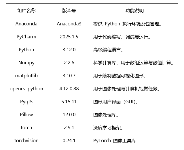对本实验所需的各类软件及工具的基本信息进行了清晰汇总。