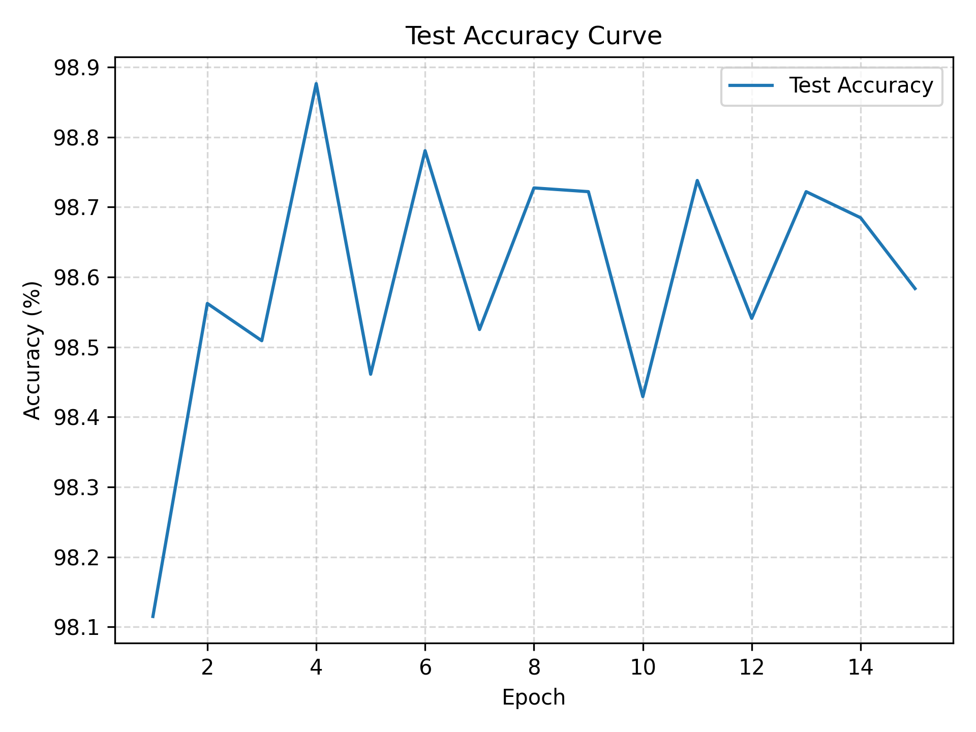 展示了模型在 1~15 轮训练中的测试集准确率变化趋势。整体准确率稳定在 98.1%~98.9% 之间,并在第 4 轮达到最高点 98.88%。曲线呈现轻微波动,说明模型在测试数据上具有较好的泛化能力,且训练过程中未出现明显的过拟合或欠拟合现象。