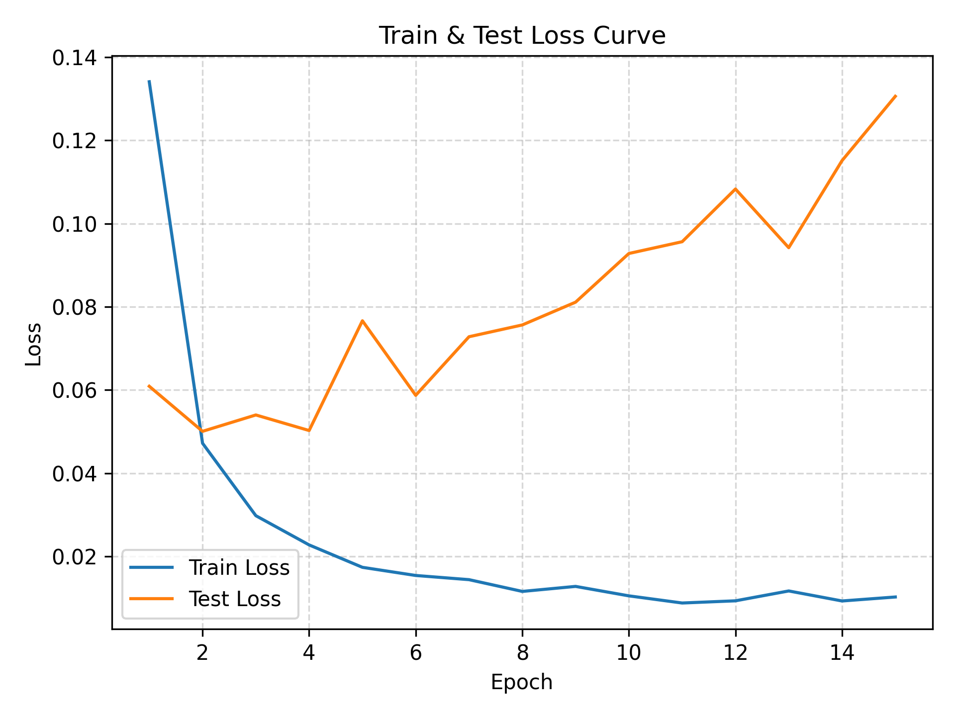 展示了模型在整个训练过程中训练损失与测试损失的变化趋势。训练损失持续下降并最终收敛到约 0.01,而测试损失整体呈现轻微波动但保持在 0.05~0.13 区间,反映模型具有良好的学习能力,同时在测试集上的稳定性较高。