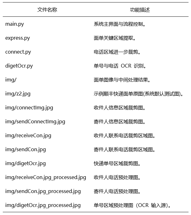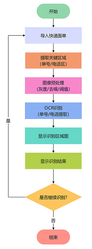 本系统基于顺丰快递面单的结构特点,从整体架构、功能模块划分与关键技术流程出发,构建了由图像预处理、关键信息提取、OCR识别和界面交互组成的面单智能识别系统设计方案