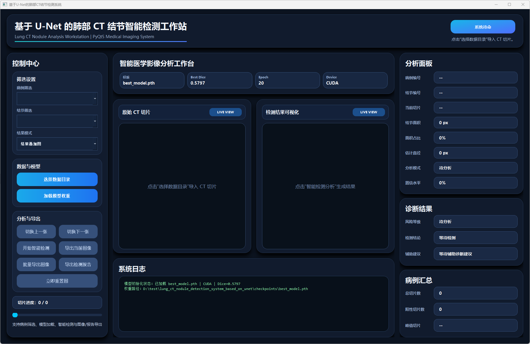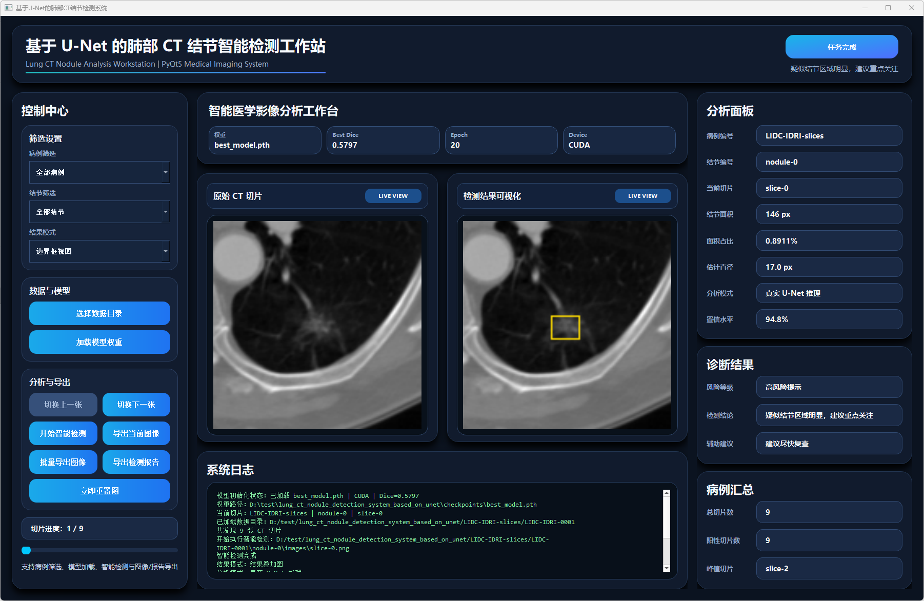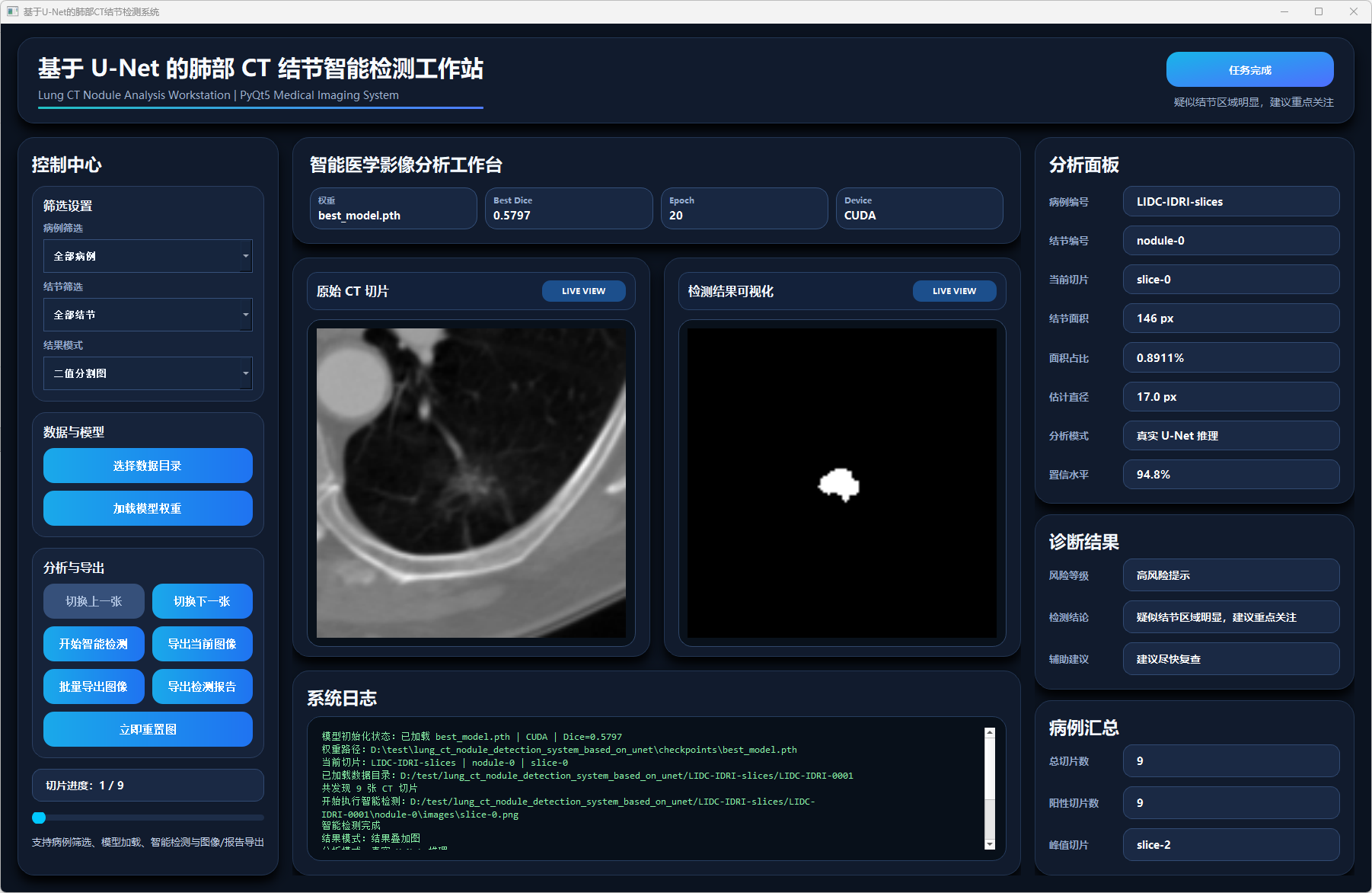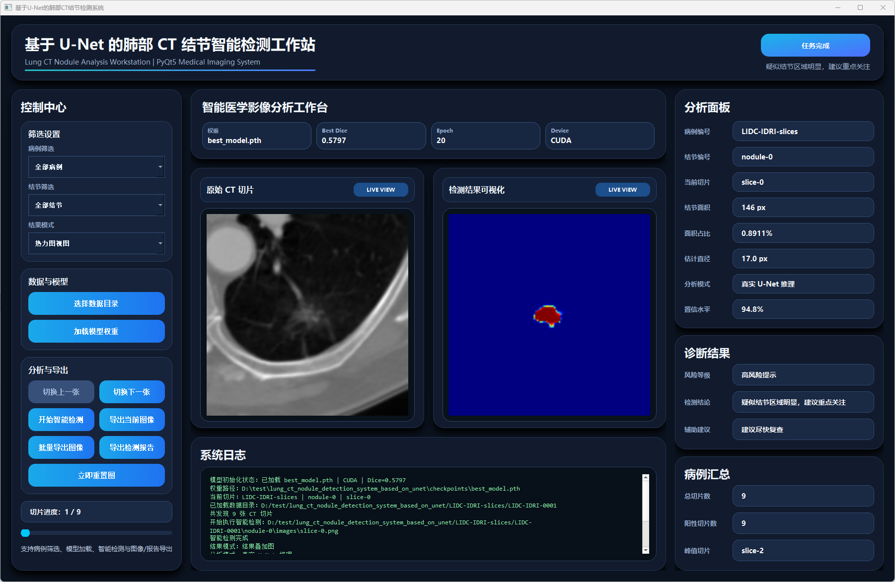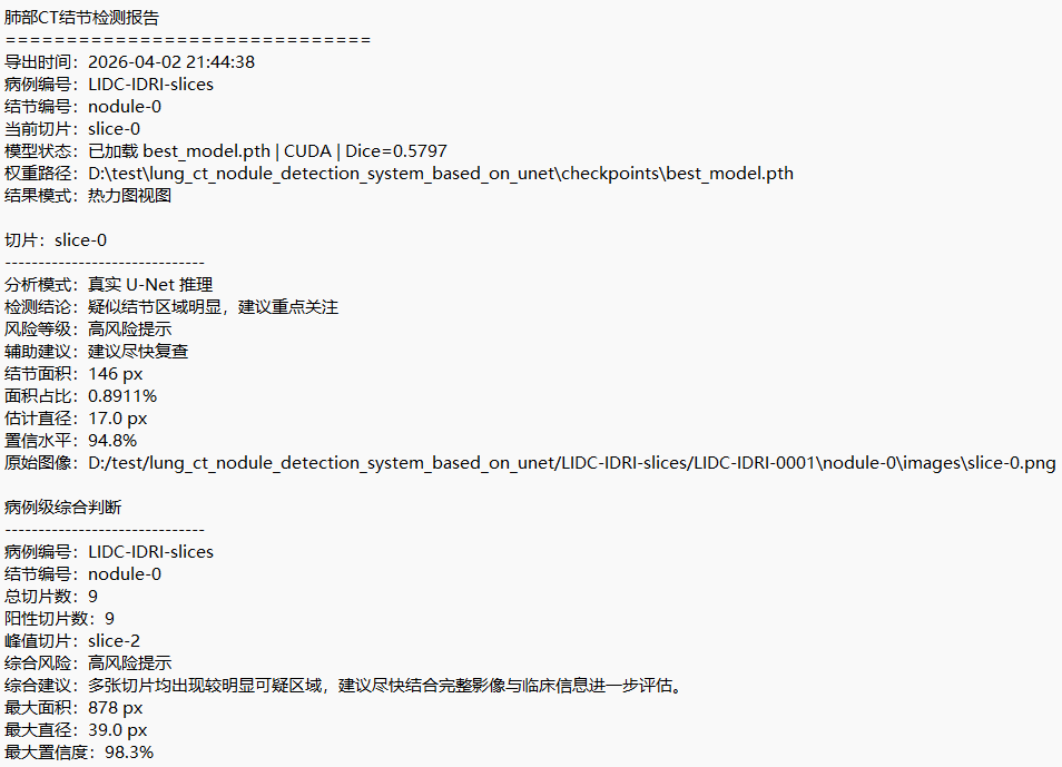 本文围绕肺部CT结节检测任务,设计并实现了一种基于U-Net的肺部CT结节检测系统。系统以肺部CT切片为输入,利用U-Net模型对图像中的结节区域进行分割与检测,并结合面积、直径、面积占比、置信水平等指标,对结节风险进行辅助分析。系统前端采用PyQt5构建可视化界面,实现了数据目录导入、病例筛选、结节筛选、检测结果可视化、病例汇总分析以及检测报告导出等功能。后端通过深度学习模型完成图像推理,并支持结果叠加图、二值分割图、边界框视图和热力图视图等多种显示方式,从而增强了检测结果的直观性和可解释性。