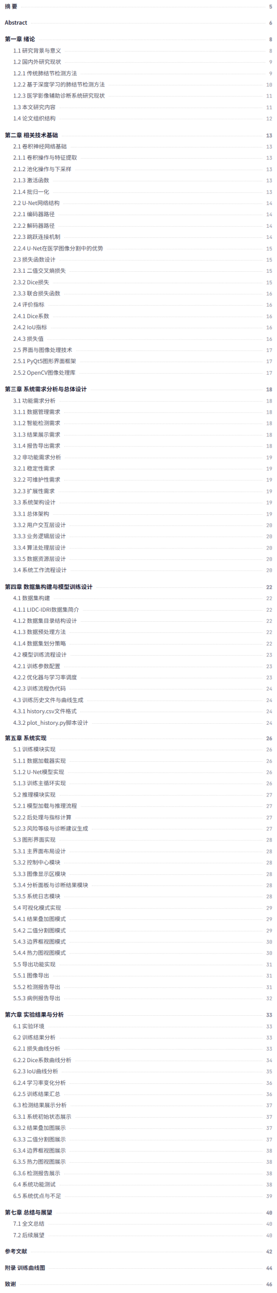 本文围绕肺部CT结节检测任务,设计并实现了一种基于U-Net的肺部CT结节检测系统。系统以肺部CT切片为输入,利用U-Net模型对图像中的结节区域进行分割与检测,并结合面积、直径、面积占比、置信水平等指标,对结节风险进行辅助分析。系统前端采用PyQt5构建可视化界面,实现了数据目录导入、病例筛选、结节筛选、检测结果可视化、病例汇总分析以及检测报告导出等功能。后端通过深度学习模型完成图像推理,并支持结果叠加图、二值分割图、边界框视图和热力图视图等多种显示方式,从而增强了检测结果的直观性和可解释性。