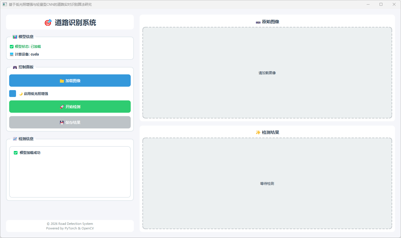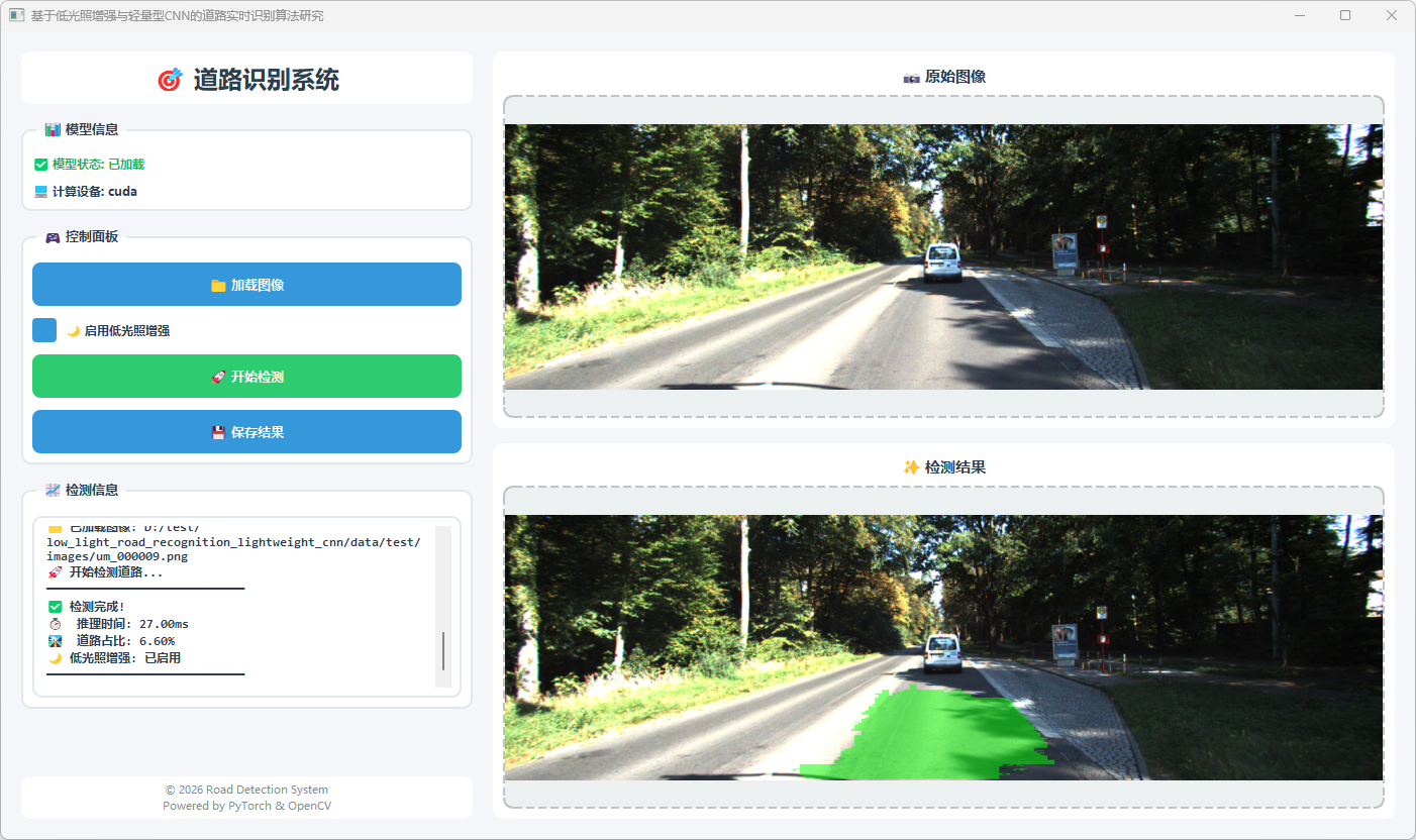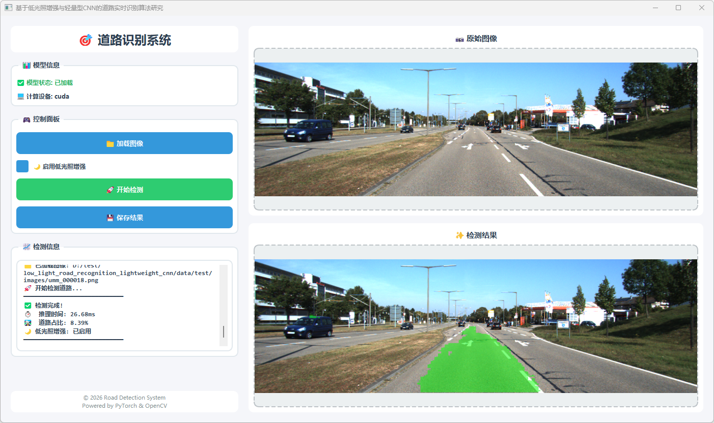 本系统成功实现了基于低光照增强与轻量型CNN的道路实时识别算法。通过融合CLAHE自适应直方图均衡化和Gamma校正的混合增强方法,有效解决了夜间和弱光环境下图像质量下降的问题;采用深度可分离卷积构建的编码器-解码器网络,在保证识别准确率94.51%的同时,将模型参数量压缩至3.8MB,单帧推理时间控制在36-57ms,满足实时性要求。系统提供了命令行和PyQt5图形界面两种交互方式,支持图像和视频的道路分割检测,可视化效果直观清晰。