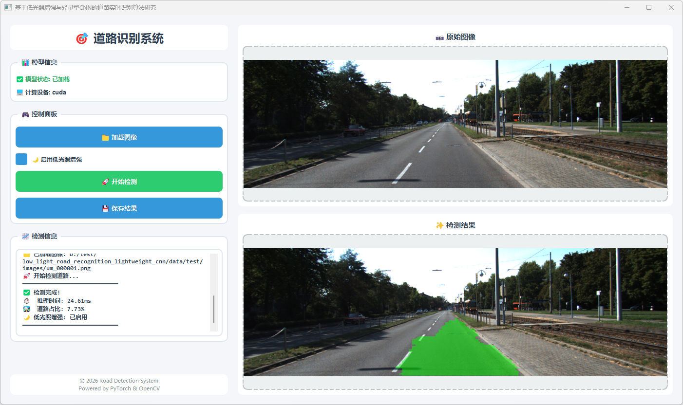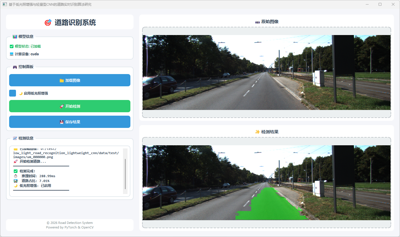 本文设计了自适应低光照增强模块,融合CLAHE(对比度受限自适应直方图均衡化)和Gamma校正技术,有效提升低光照图像的亮度和对比度,增强道路区域的可辨识性。其次,构建了基于深度可分离卷积的轻量级语义分割网络,采用编码器-解码器架构,通过深度可分离卷积替代标准卷积,大幅降低模型参数量和计算复杂度。最后,在KITTIRoad数据集上进行训练和验证,并开发了基于PyQt5的可视化检测系统。
