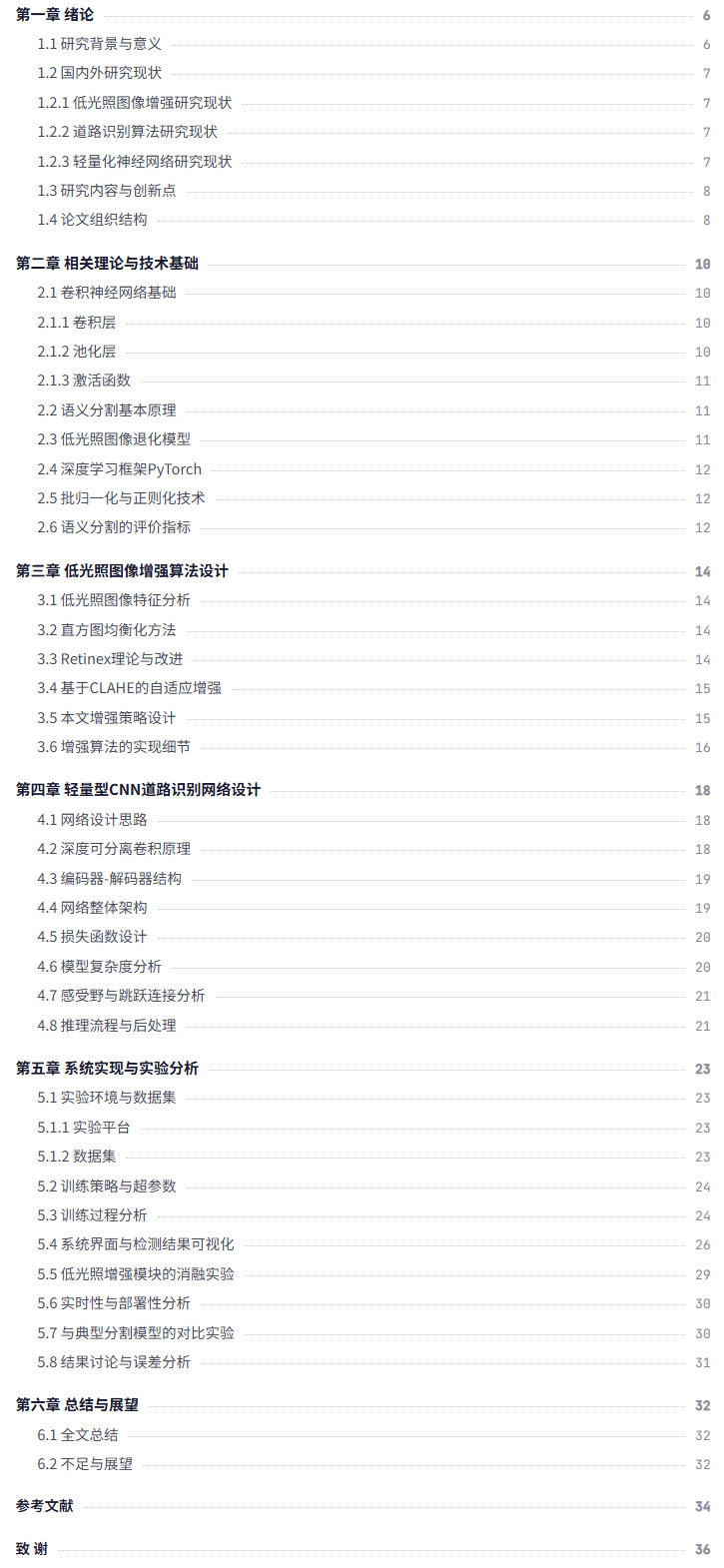 实验结果表明,本文提出的算法在保持较高识别准确率的同时,模型大小仅为3.8MB,单帧推理时间为36-57ms,满足实时性要求。在郊区道路场景下,道路区域识别准确,边界清晰;低光照增强模块显著改善了暗光环境下的检测效果。该算法为嵌入式设备上的实时道路识别提供了有效解决方案,具有良好的应用前景。
