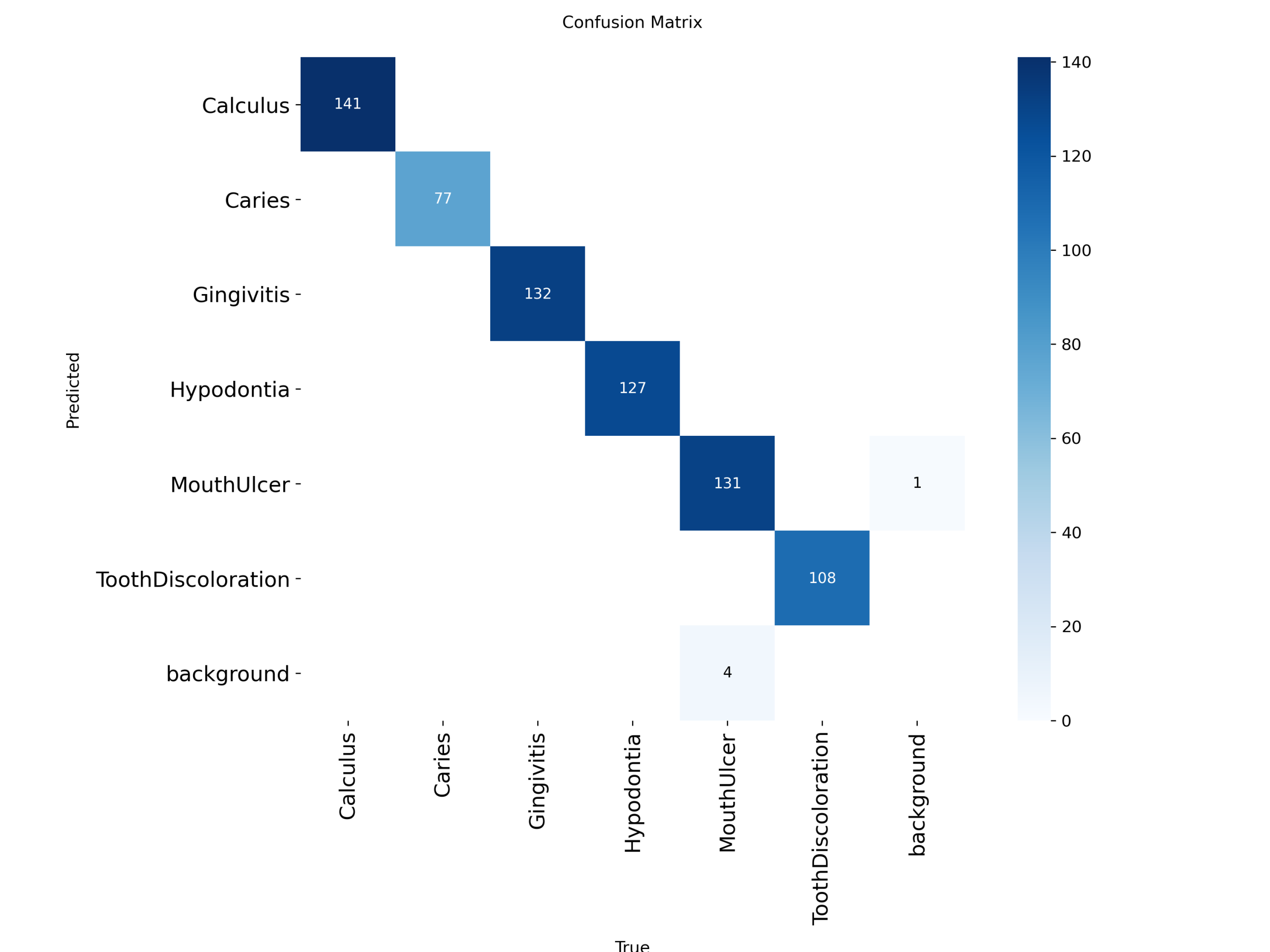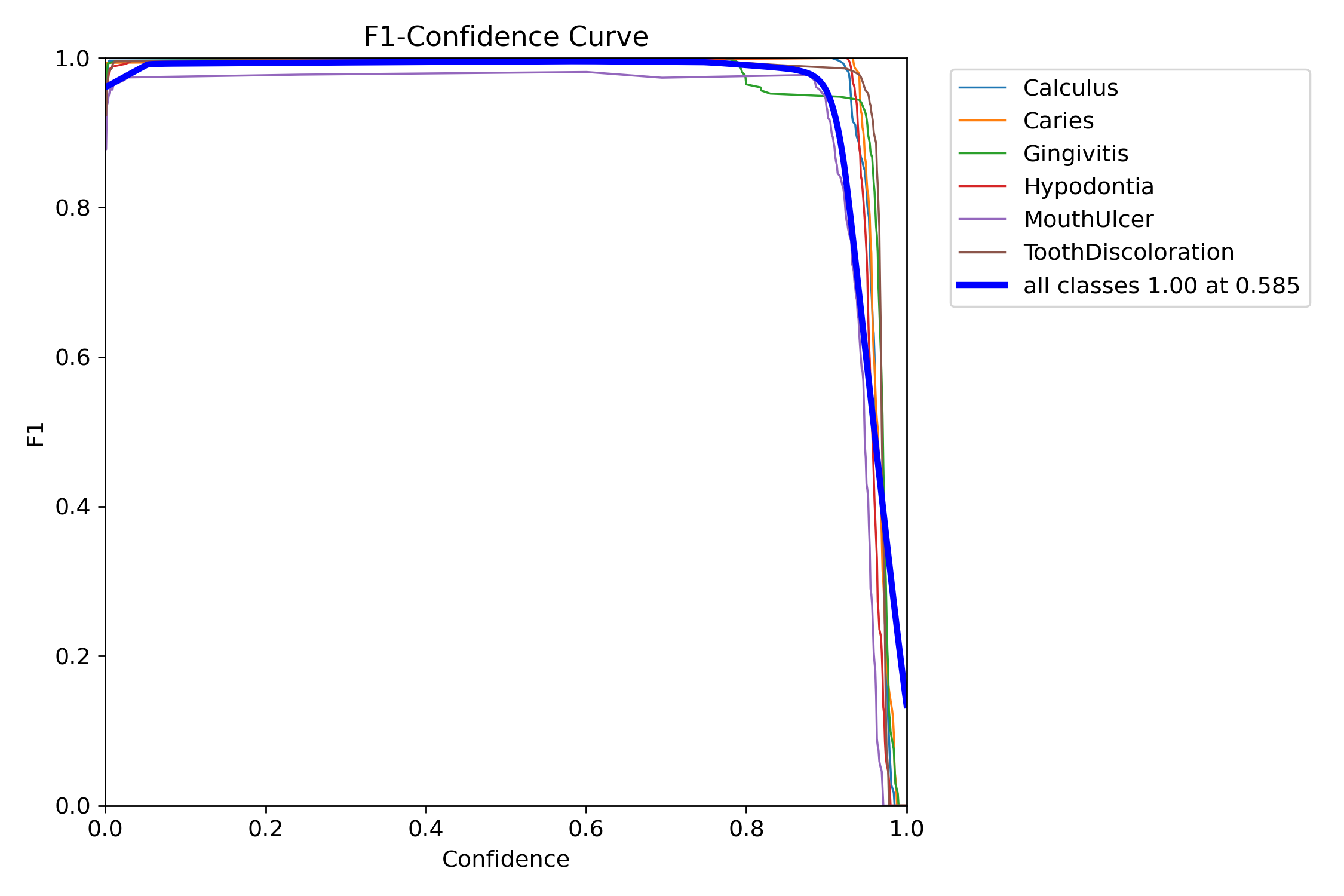 本研究所使用的数据集为口腔疾病检测数据集,图像数据来源于真实临床环境下口腔图像的采集、整理与筛选,并在预处理后形成适用于目标检测任务的数据集。所有图像均采用YOLO格式进行边界框标注,目标类别定义为牙结石(Calculus)、龋齿(Caries)、牙龈炎(Gingivitis)、牙齿缺失(Hypodontia)、口腔溃疡(MouthUlcer)、牙齿变色(ToothDiscoloration)六类,共计标注了3616个病变实例。整个标注过程遵循统一规范,以保证数据标注的一致性和准确性,为后续YOLOv8及YOLOv8-CBAM模型训练、性能评估以及系统应用提供了可靠的数据支撑。