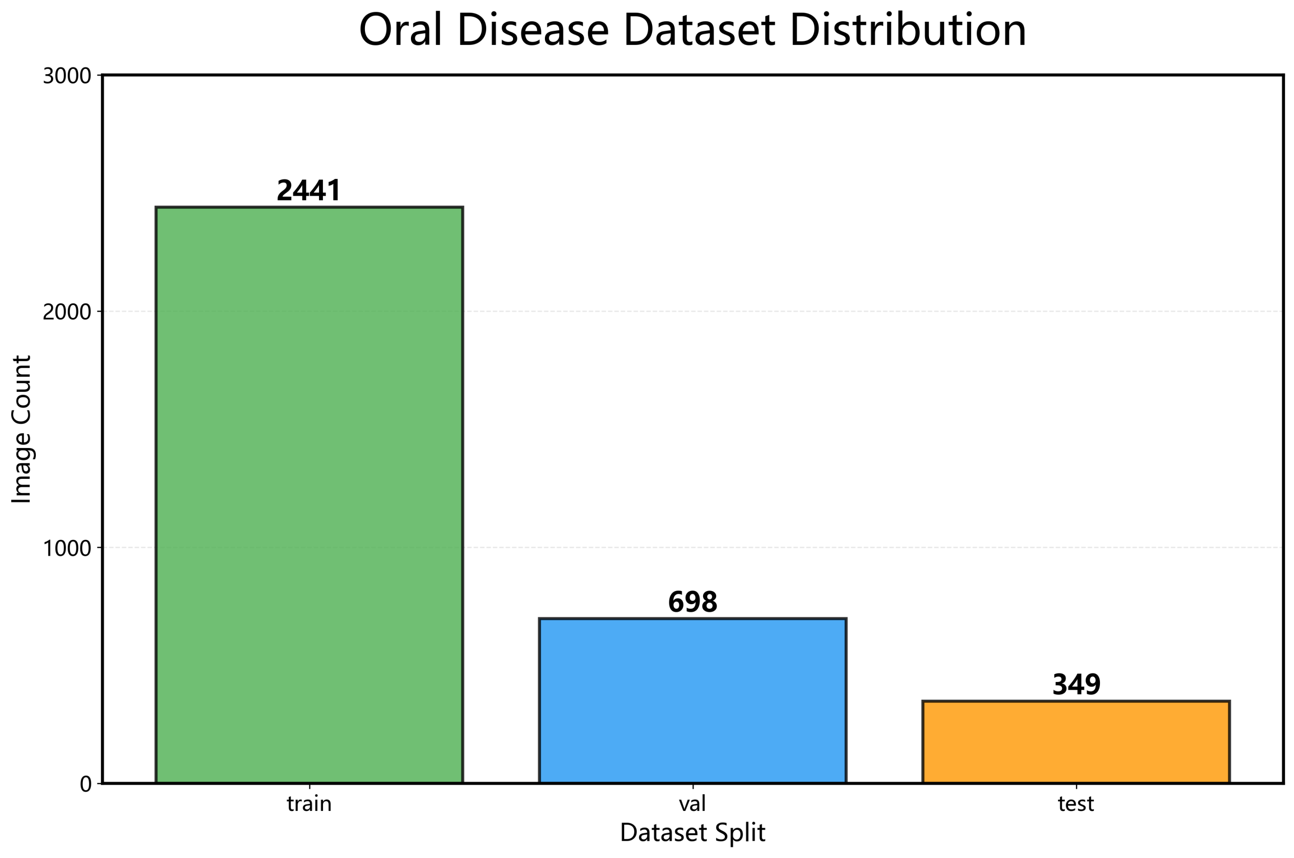 本数据集专为口腔疾病检测任务构建,包含3488张口腔图像,共标注3488个病变目标。数据集采用标准YOLO格式,涵盖牙结石(Calculus)、龋齿(Caries)、牙龈炎(Gingivitis)、牙齿缺失(Hypodontia)、口腔溃疡(MouthUlcer)、牙齿变色(ToothDiscoloration)六大类别,按7:2:1比例划分为训练集(2441张)、验证集(698张)和测试集(349张)。所有图像来自真实临床环境,病变区域尺寸多样,对检测算法的泛化能力和精度提出了较高要求。数据集支持主流深度学习框架直接调用,可用于目标检测模型的训练、验证和性能评估,为口腔疾病智能诊断提供数据支撑。