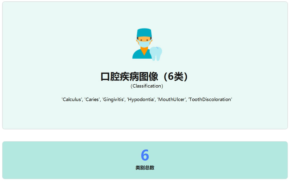 摘要:本数据集针对口腔疾病检测中病变特征识别难、人工诊断效率低等问题,构建了包含3139张图像、3139个标注框的YOLO格式数据集,涵盖龋齿、牙龈炎、口腔溃疡、牙结石、牙齿缺失、牙齿变色六类常见口腔疾病,支持多尺度病变区域的高精度检测模型训练与评估
