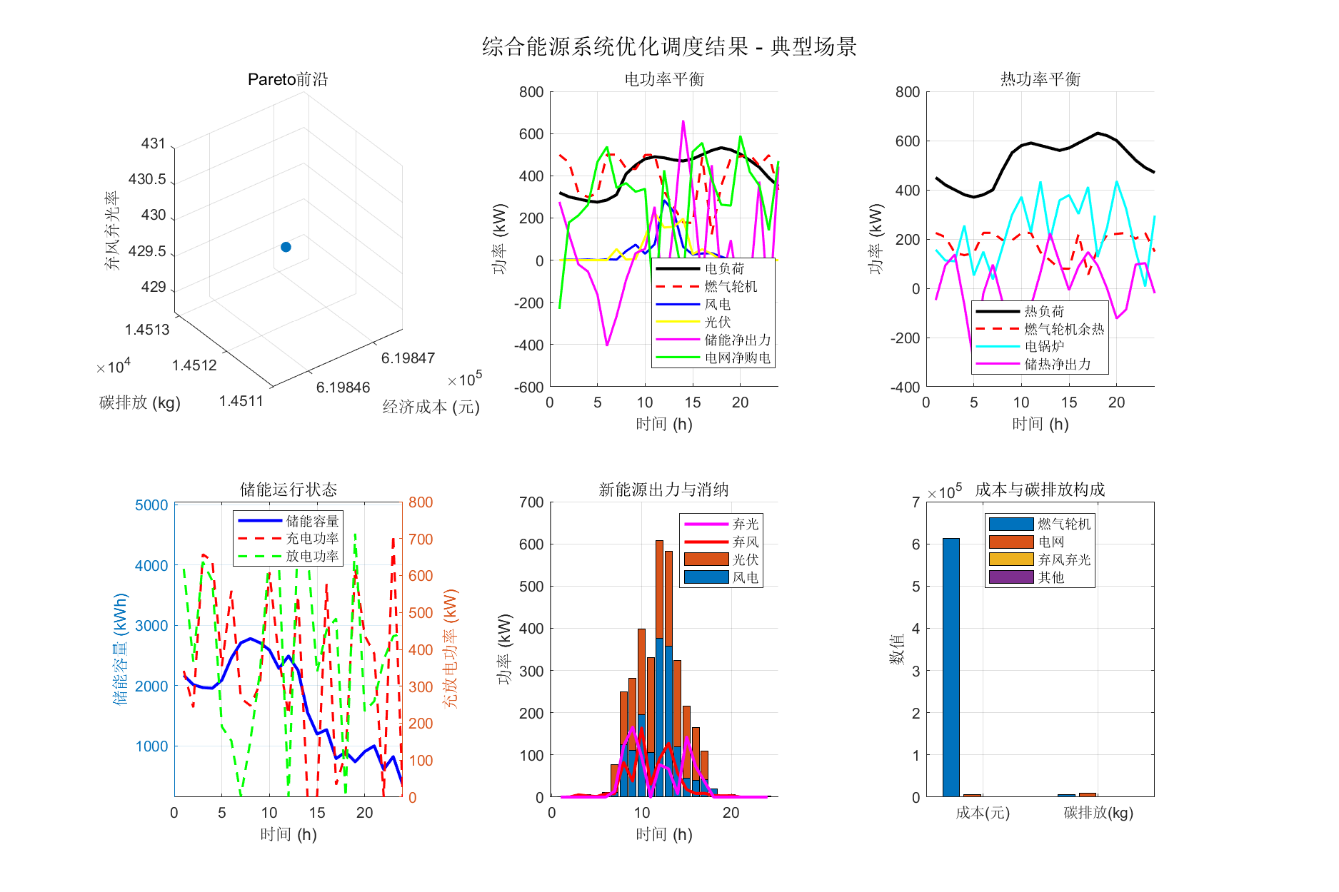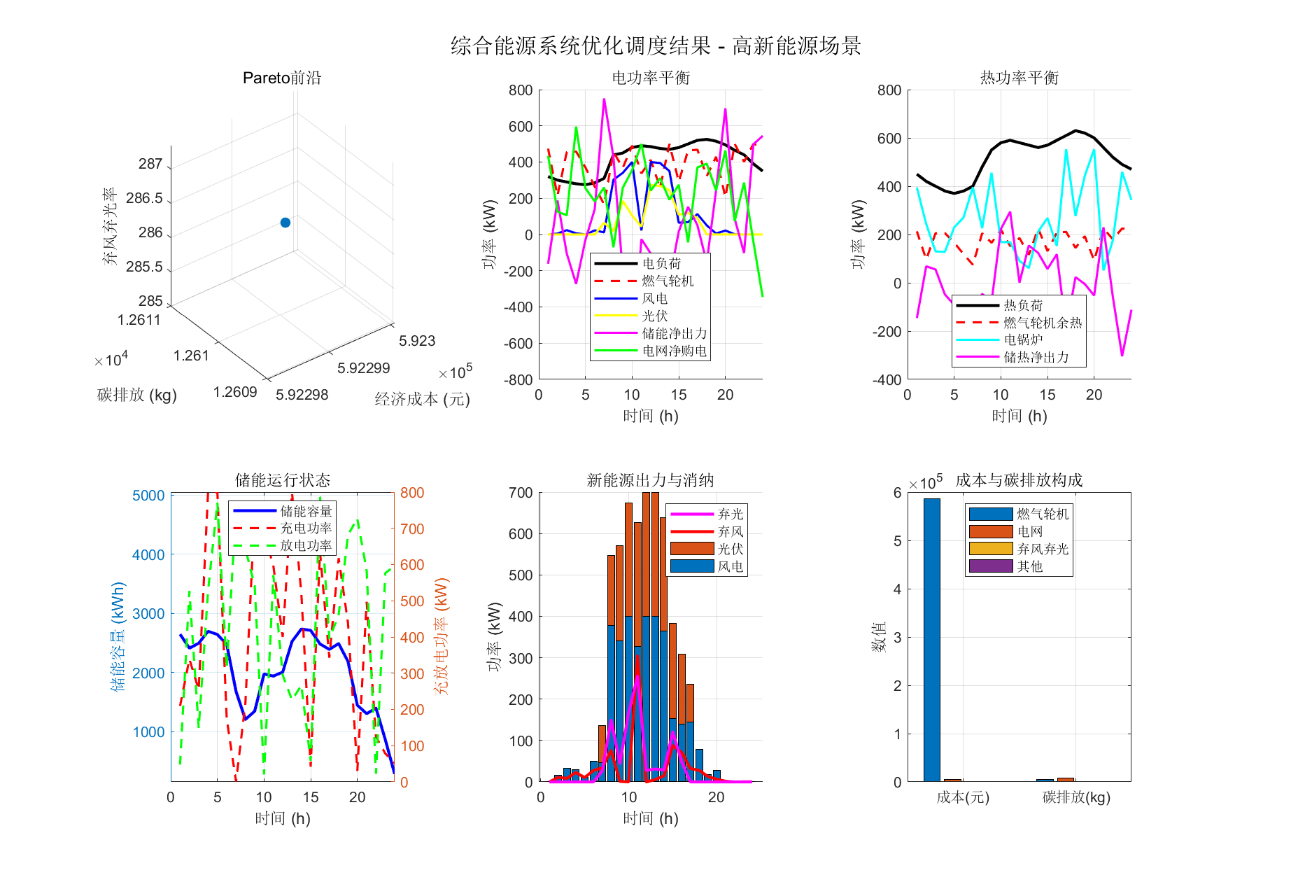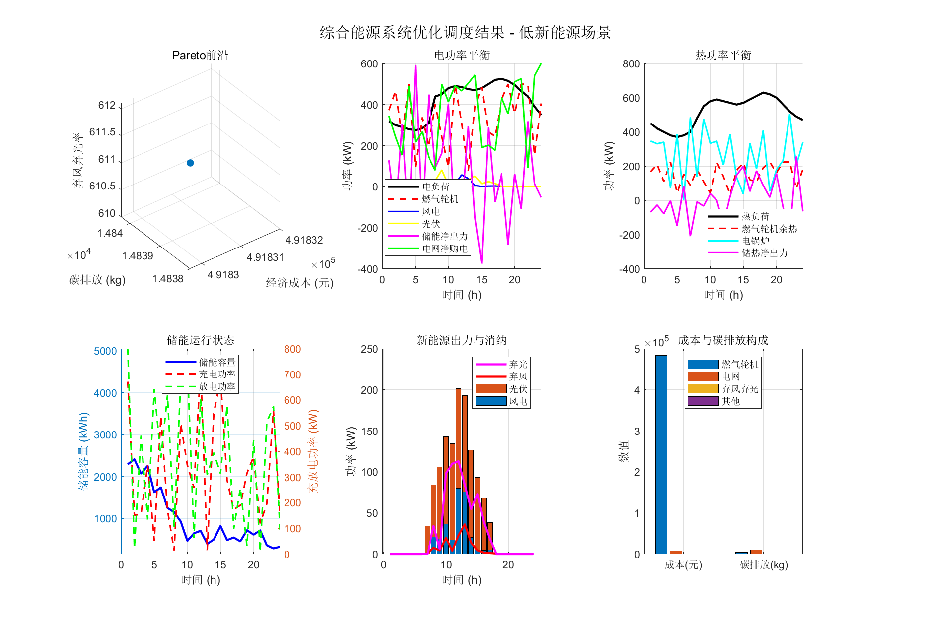 建立了包含功率平衡、设备容量、储能状态、爬坡约束等完整约束条件的优化模型,采用NSGA-II算法求解Pareto最优解集,通过非支 配排序、拥挤度计算和精英保留策略保证解的质量和多样性。基于加权法从Pareto前沿中选择折中方案,权重系数为经济成本0.4、碳 排放0.3、新能源消纳0.3。通过MATLAB编程实现了150个体、250代的优化求解,设计了典型场景、高新能源场景(风电3362 kWh、光伏2425 kWh)、低新能源场景(风电287 kWh、光伏938 kWh)三种对比场景。