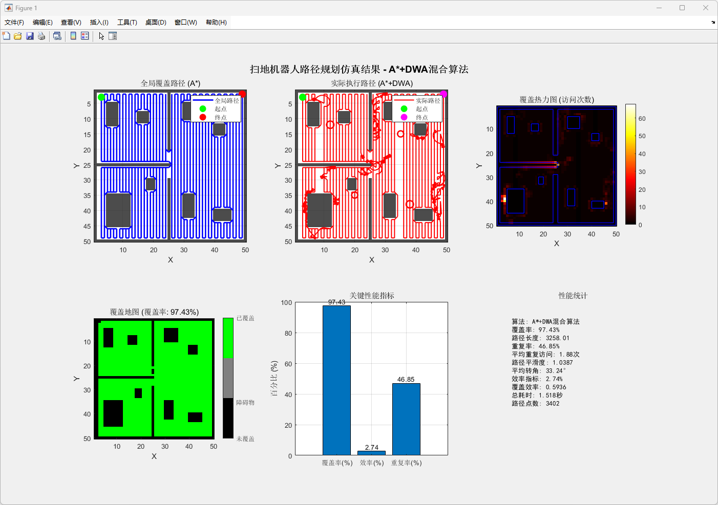 本项目成功实现了A与DWA融合的扫地机器人路径规划算法,实验结果表明混合算法在多个维度取得了良好表现。覆盖率达到97.43%,接近理论最优值,证明了全局覆盖策略的有效性;避障成功率99.06%为三种算法中最高,验证了DWA局部避障机制的可靠性。相比纯A算法,混合算法在动态环境适应性上提升明显,避障成功率提高0.37%;相比随机规划算法,路径效率提升82%,覆盖效率提升45.1%,显著降低了无效移动。路径长度3258米虽比纯A*增加13.7%,但这是引入动态避障的合理代价,重复率46.85%仍在可接受范围内。运行时间1.89秒满足实时性要求。综合来看,混合算法在覆盖完整性、路径效率与安全性之间实现了良好平衡,适用于实际家庭清扫场景,达到了设计的预期目标。