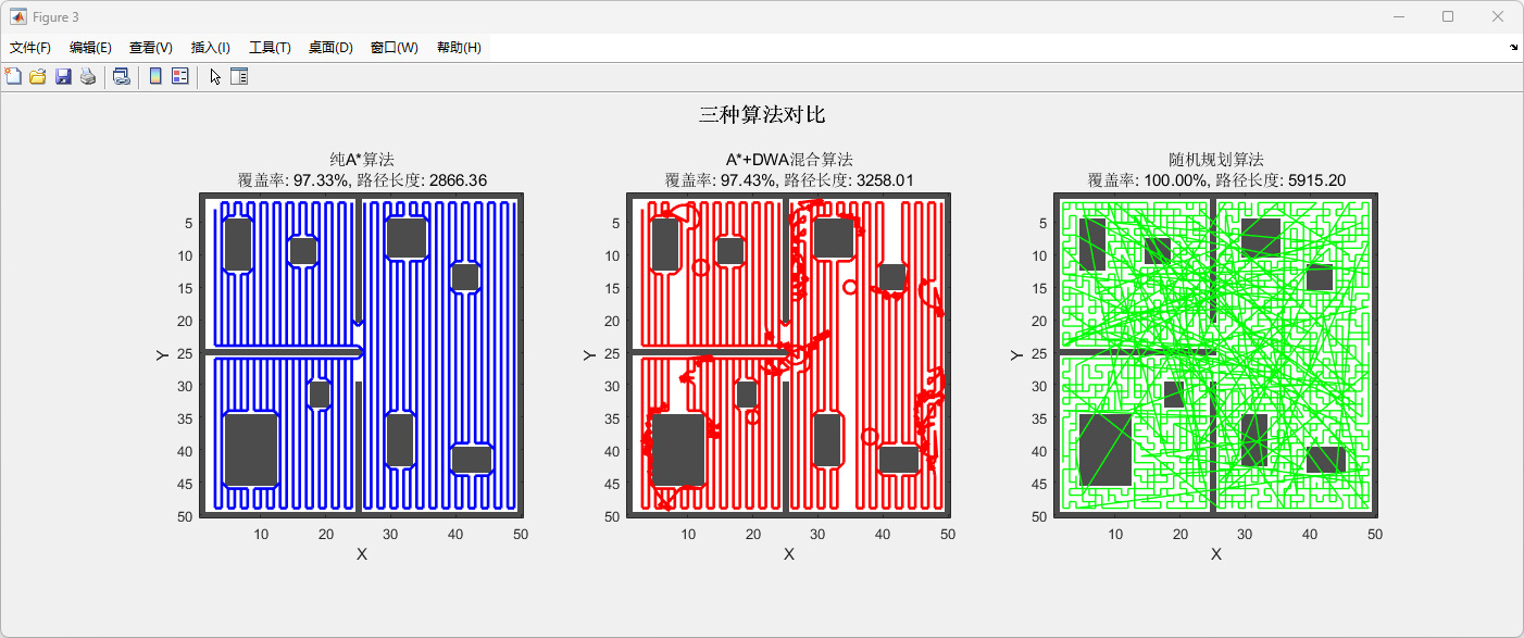 在MATLAB平台搭建仿真系统,设置50×50栅格多房间场景,包含客厅、卧室、厨房、书房四个房间,515个静态障碍栅格和4个动态障碍物。实验结果表明:混合算法覆盖率达97.43%,路径长度3258m,避障成功率99.06%,运行时间1.537秒。