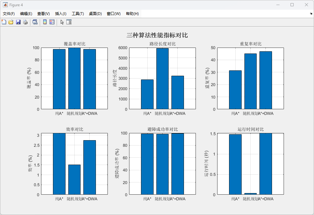 打开MATLAB并切换到项目目录,进入src文件夹后运行main命令即可启动仿真系统。程序将自动执行A*+DWA混合算法仿真,并对比纯A*、随机规划、混合算法三种方案的性能。 运行完成后,results文件夹将生成三张可视化对比图(算法结果图、路径对比图、性能指标图)和完整仿真数据文件simulation_results.mat,整个过程约需2-3秒。系统要求 MATLAB R2018b及以上版本,无需额外工具箱。
