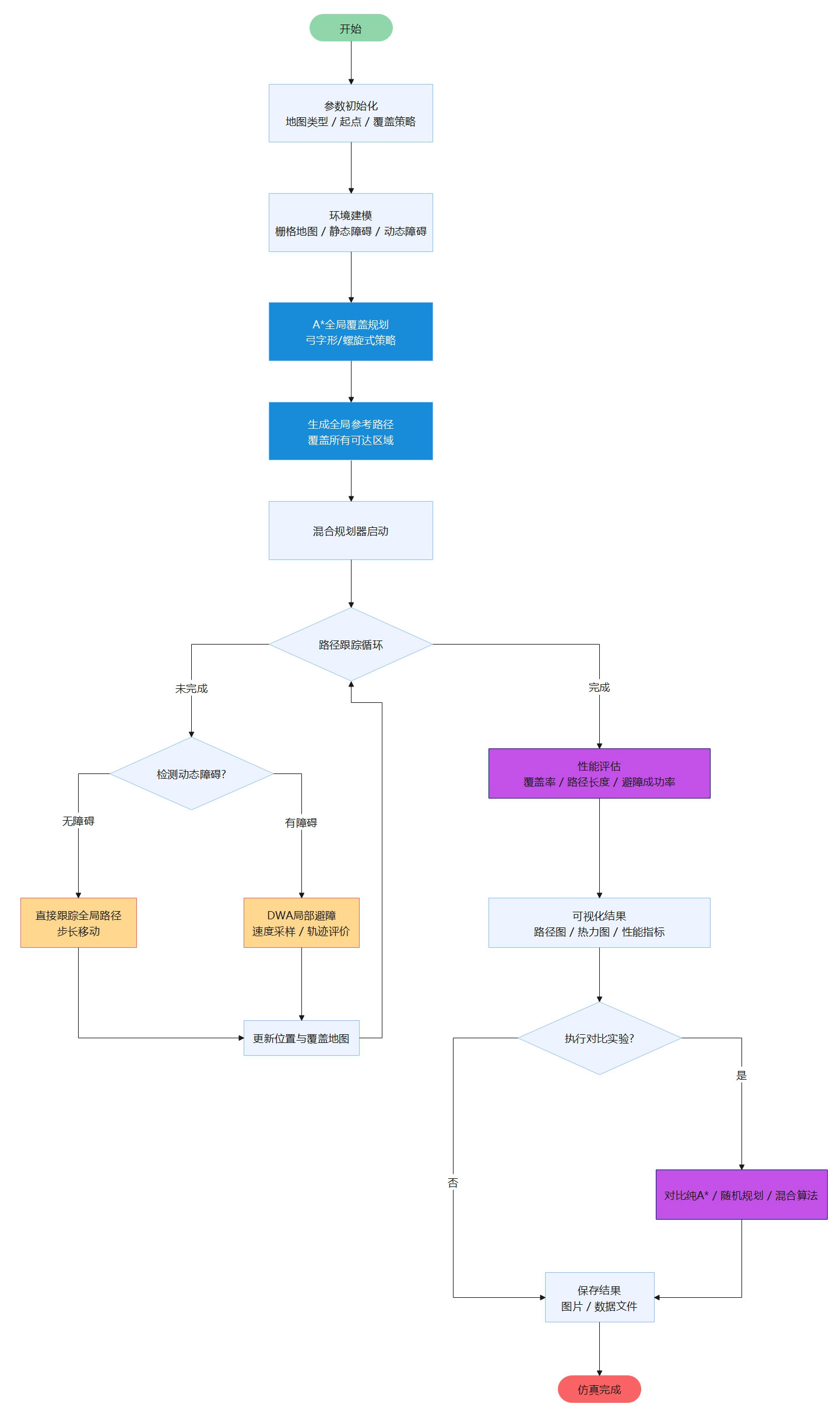 本项目实现了融合A*全局覆盖规划与DWA局部避障的扫地机器人路径规划仿真系统,适用于家庭多房间清扫场景