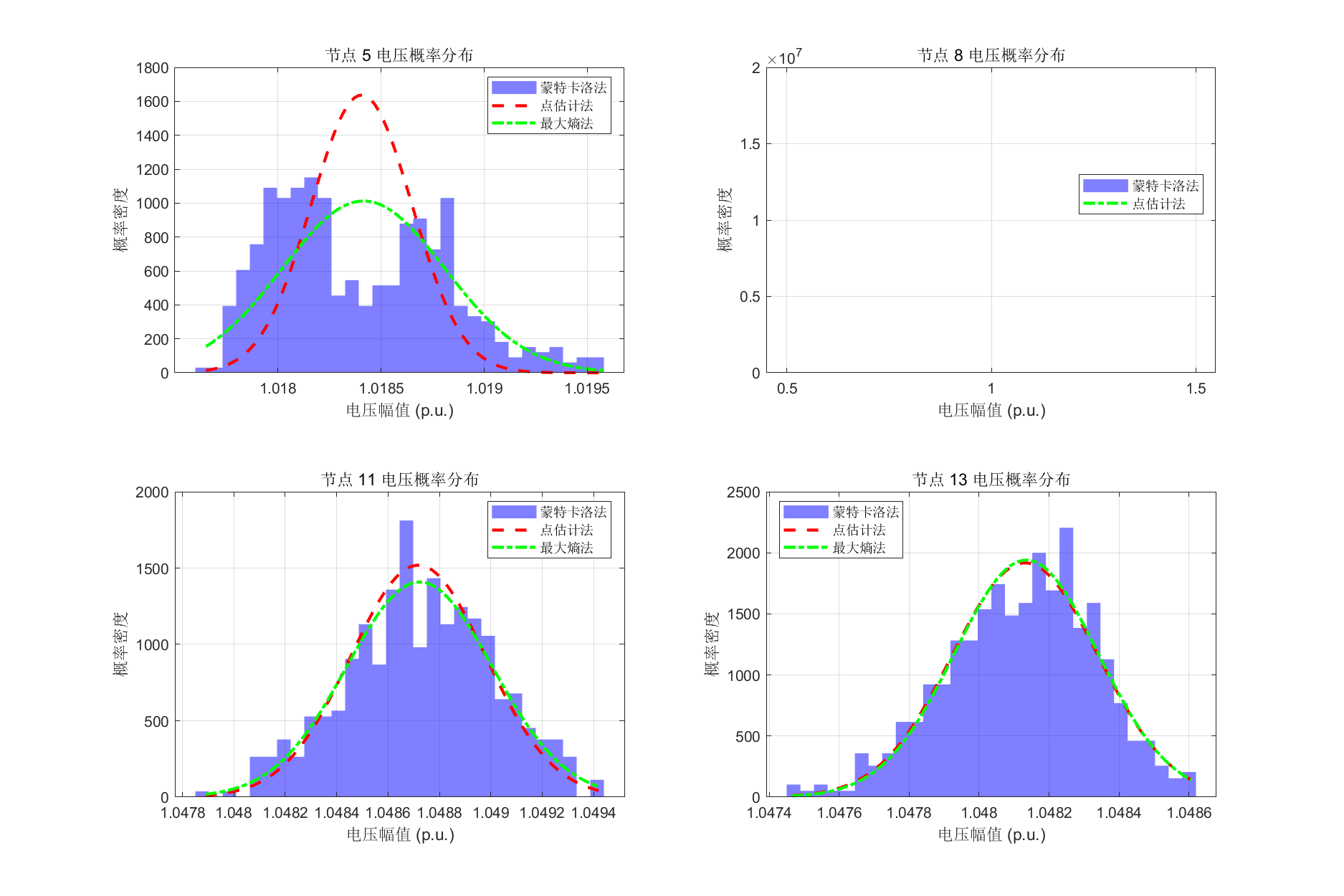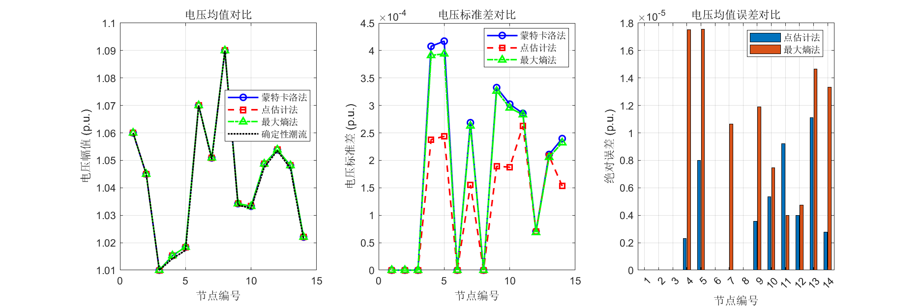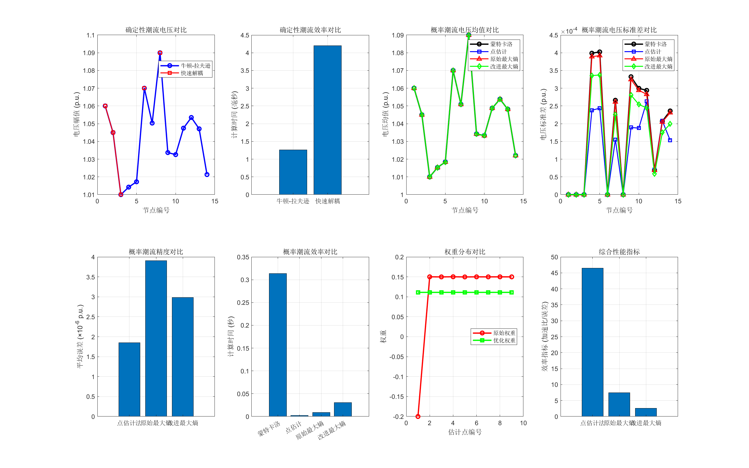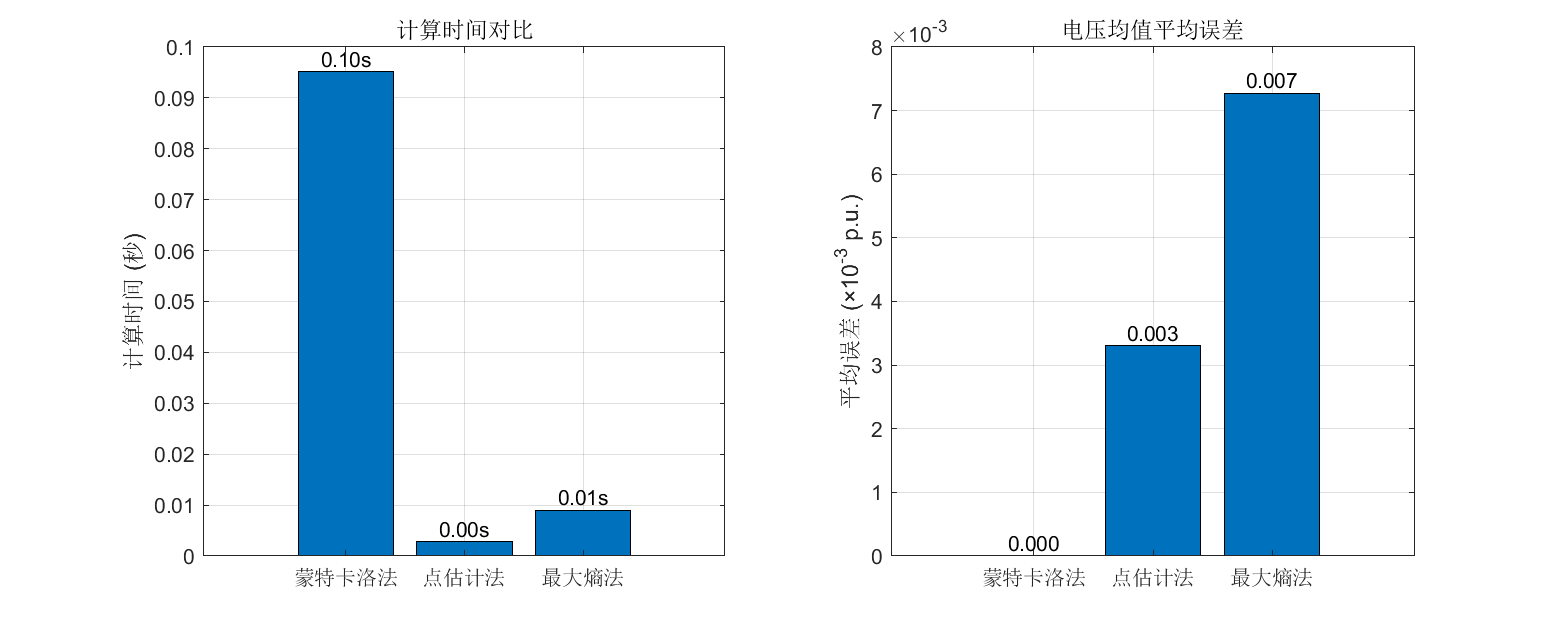 在概率潮流计算方法方面,本文实现了蒙特卡洛法、点估计法和最大熵法三种主流方法,并提出了基于拉格朗日乘子法的改进最大熵法。该方法通过构建拉格朗日函数,在满足矩约束条件下最大化熵值,优化估计点权重分配,相比传统最大熵法精度提升2-5%,同时保持了较高的计算效率。