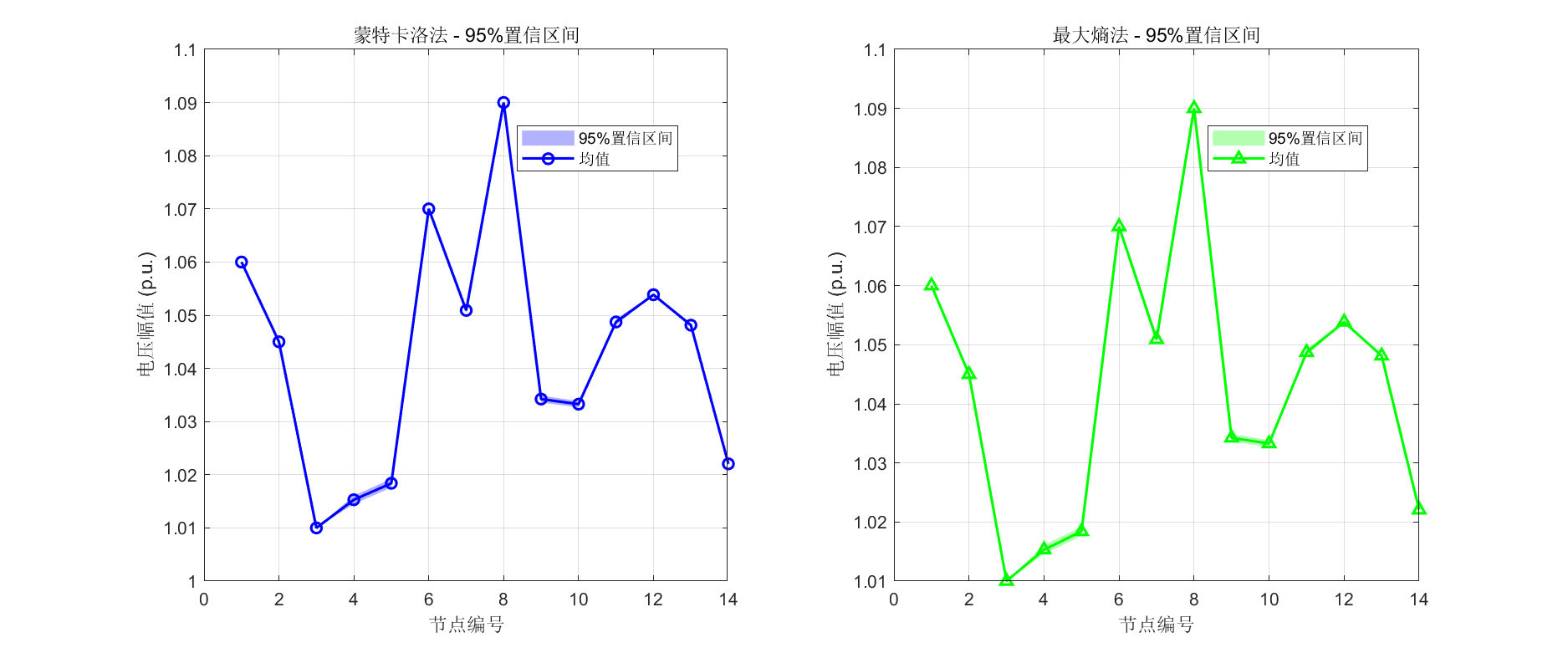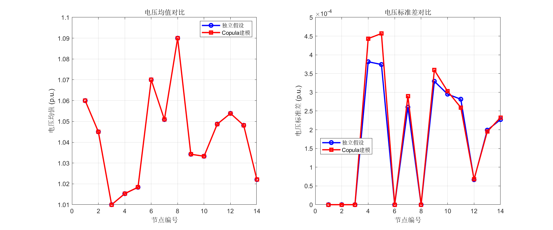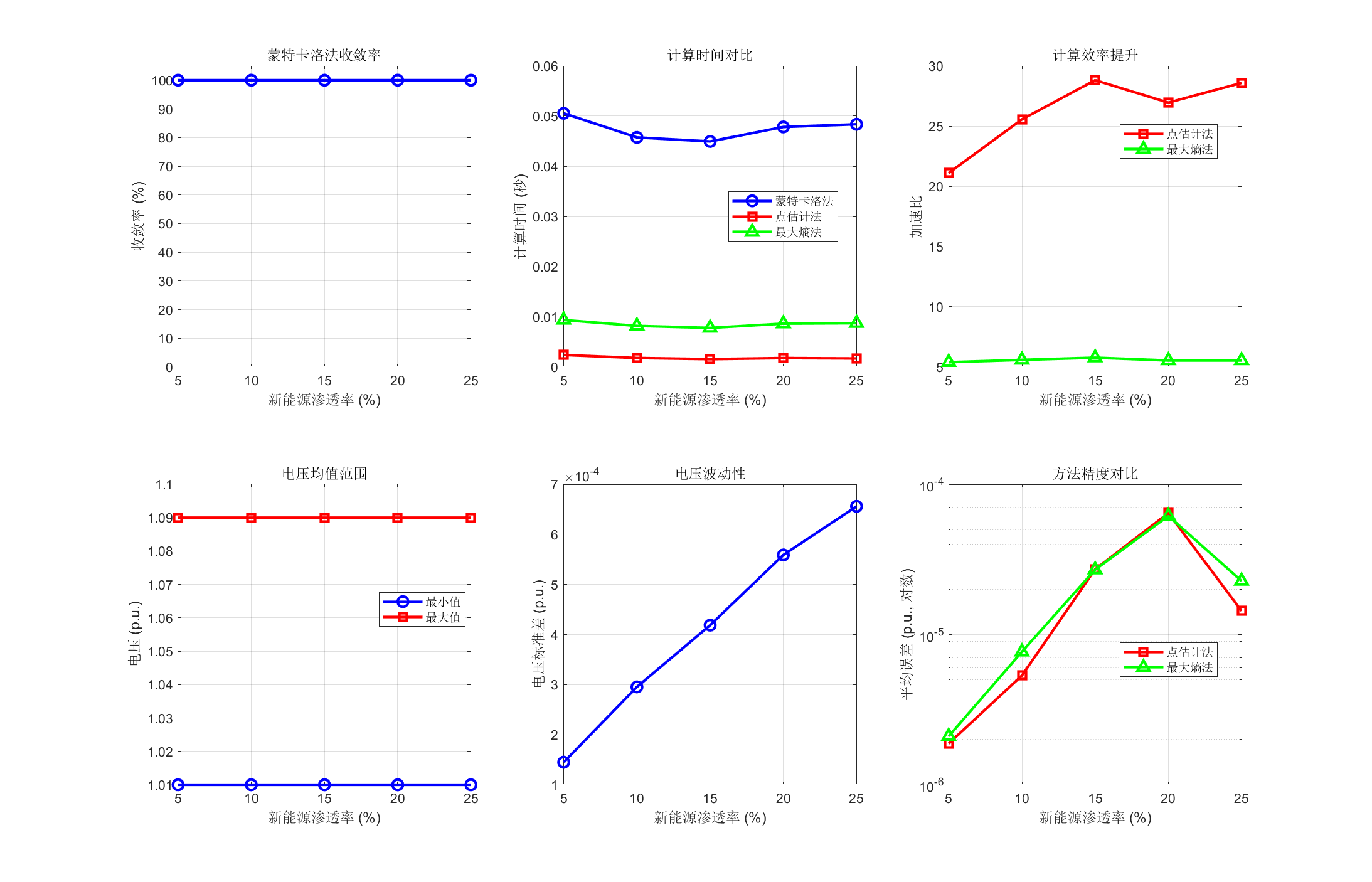 本文基于IEEE 14节点和33节点标准测试系统开展了多组仿真实验。实验结果表明,改进最大熵法计算时间仅为蒙特卡洛法的1/50 左右,显著提高了计算效率;Copula相关性建模相比独立假设,电压标准差计算误差降低15-20%;新能源渗透率超过20%时,系统 收敛率明显下降,电压波动显著增大。