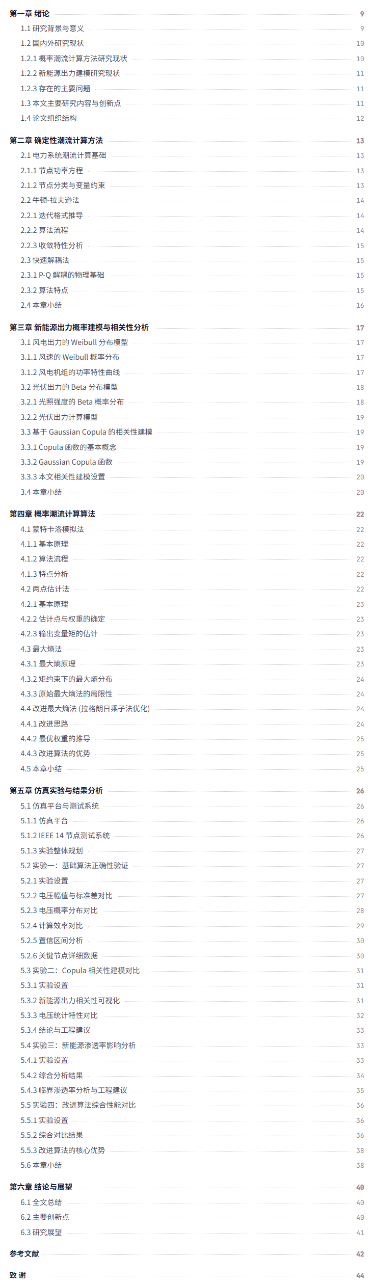 本文针对大规模新能源并网场景,研究了改进的概率潮流计算方法。首先,系统学习了牛顿-拉夫逊法、快速解耦法等经典确定性潮流计算方法,分析了其计算流程与收敛特性。其次,建立了新能源出力的概率模型,采用Weibull分布描述风电出力特性,采用Beta分布描述光伏出力特性,并引入Gaussian Copula函数建模多场站之间的相关性,为概率潮流计算提供了准确的输入模型。
