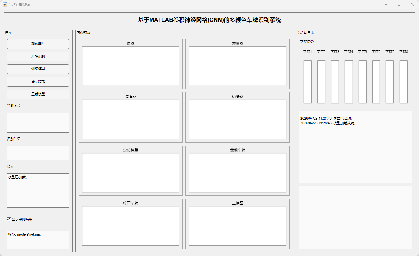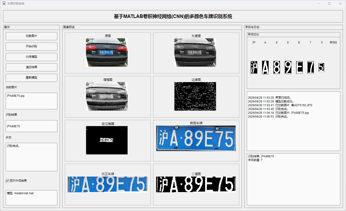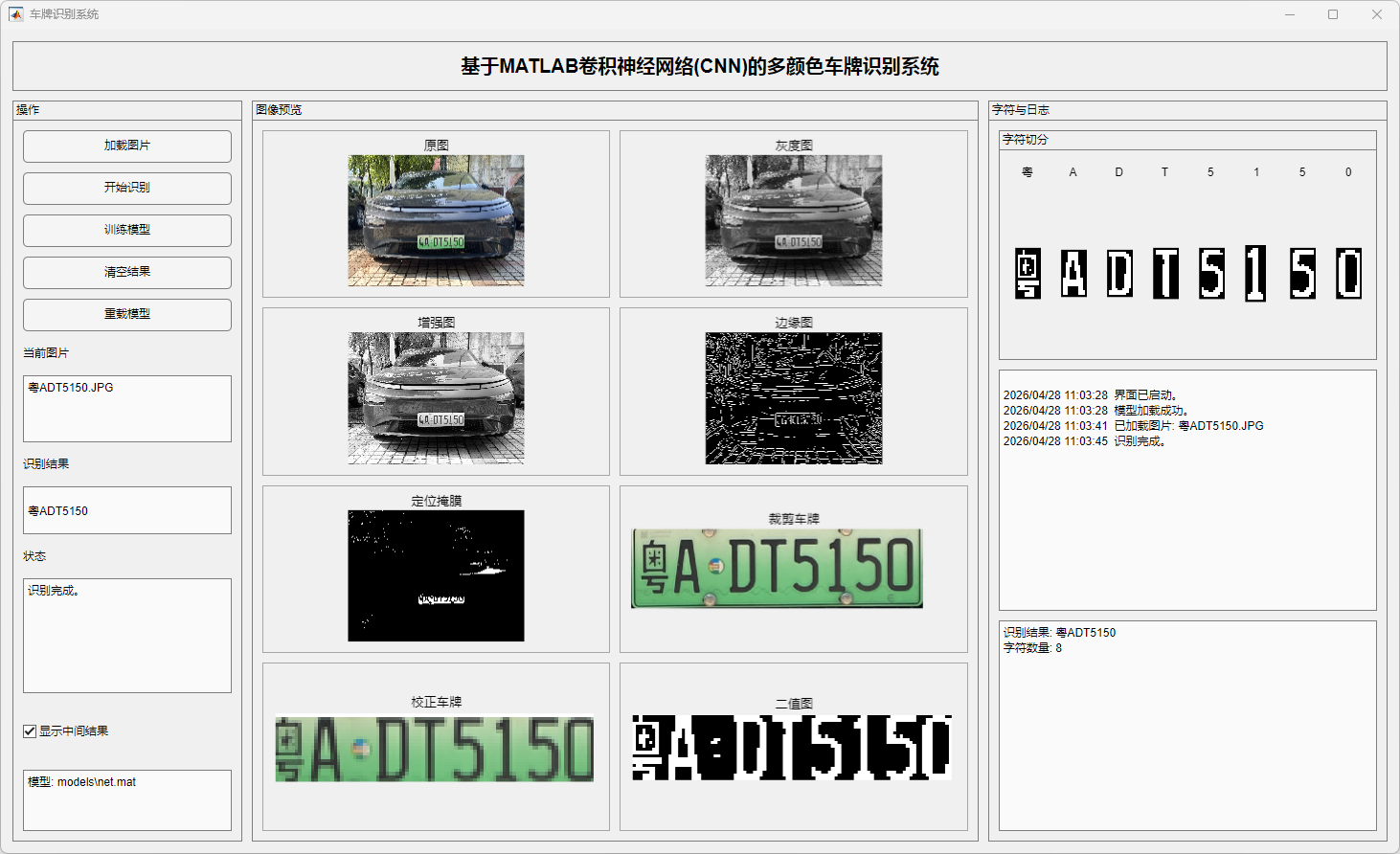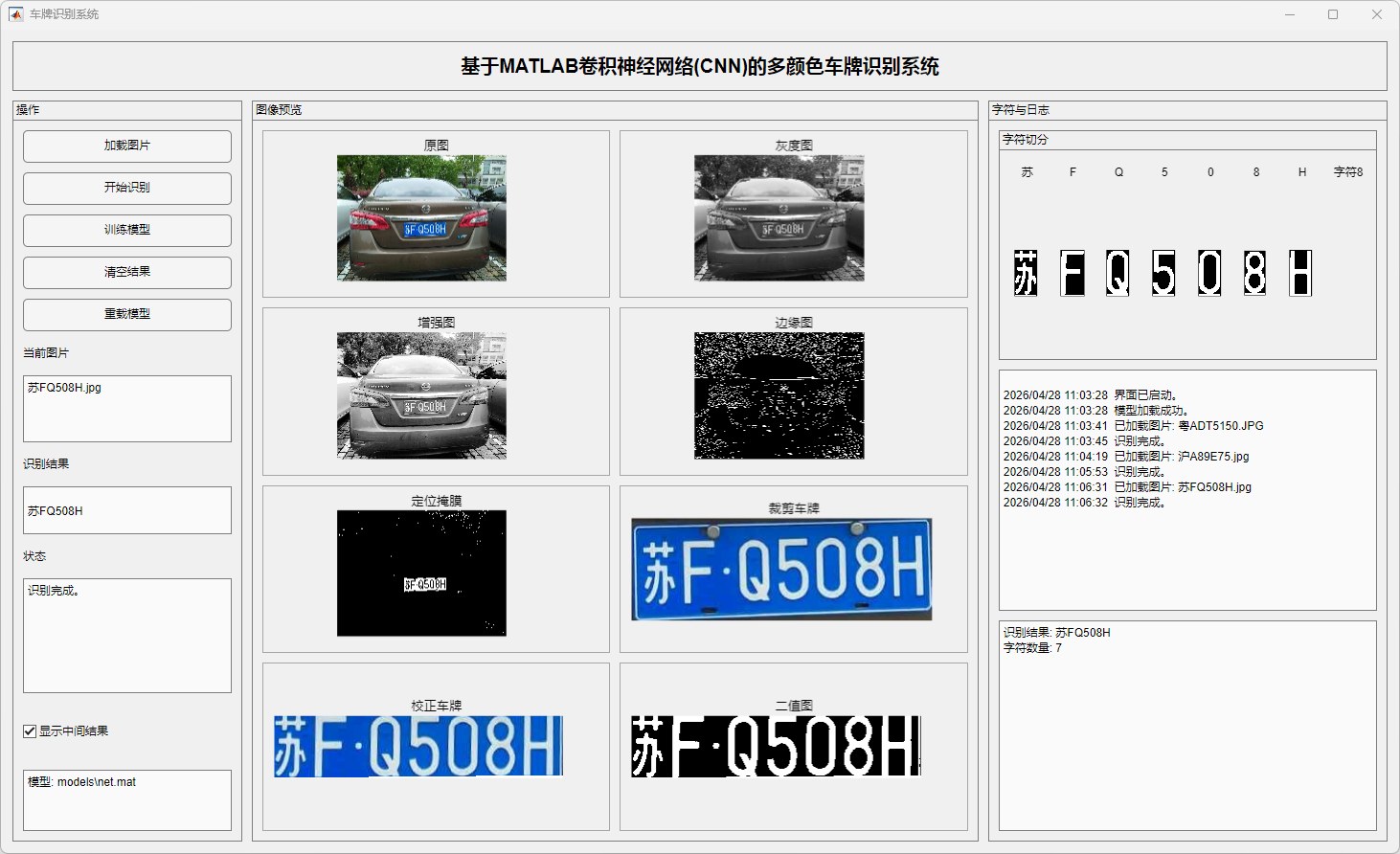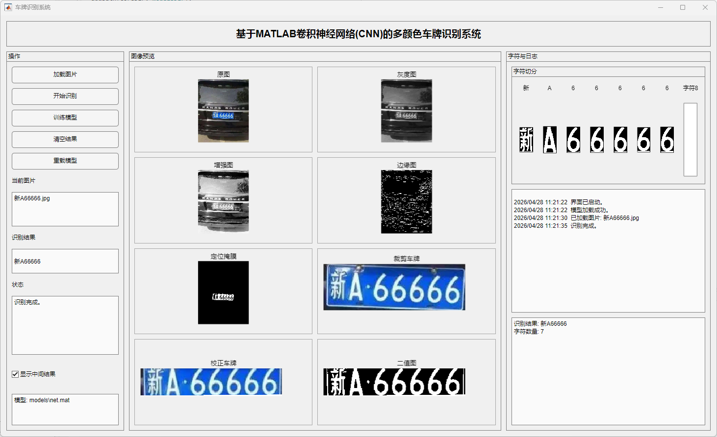 系统总体流程包括图像预处理、颜色定位、车牌区域裁剪、倾斜校正、字符分割以及卷积神经网络分类识别等环节。针对蓝牌、绿牌、黄牌等多颜色车牌,采用多颜色掩膜与候选区域筛选方法实现车牌定位;针对字符识别过程中易出现的数字与字母混淆问题,结合车牌字符位次规则和字符形态特征进行识别结果修正,从而提高系统整体识别准确率。同时,系统基于MATLAB图形界面实现了图片加载、模型训练、结果显示和中间过程可视化等功能。