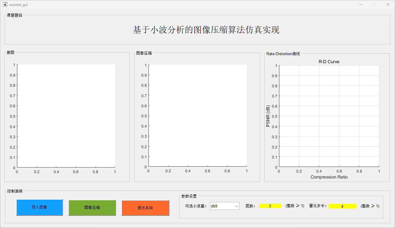 界面集成图像显示、参数设置与 R–D 曲线绘制模块,实现了小波图像压缩过程的可视化操作与结果分析。
