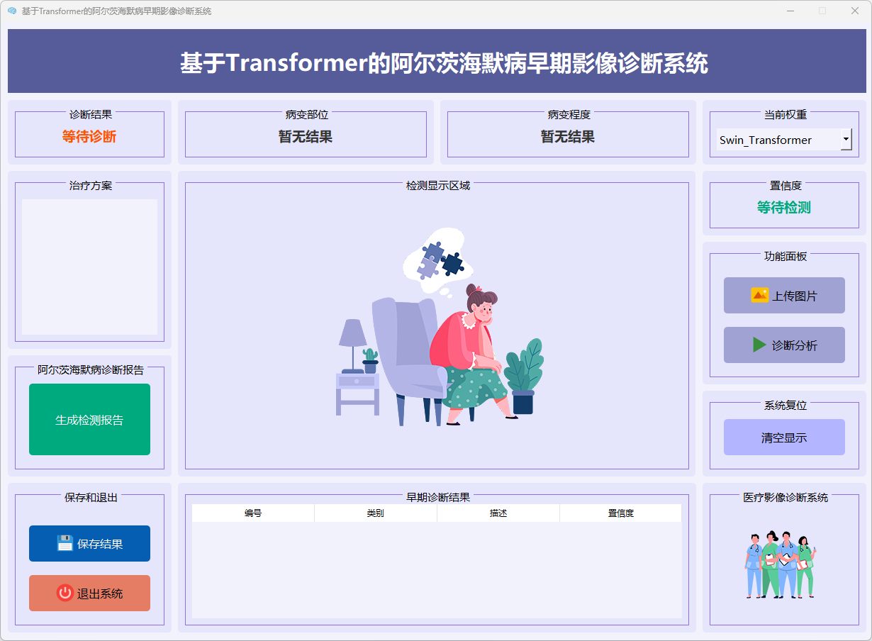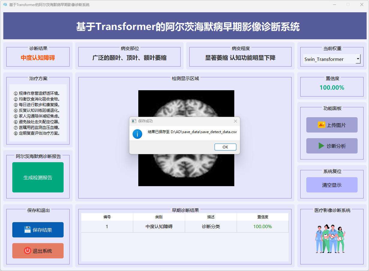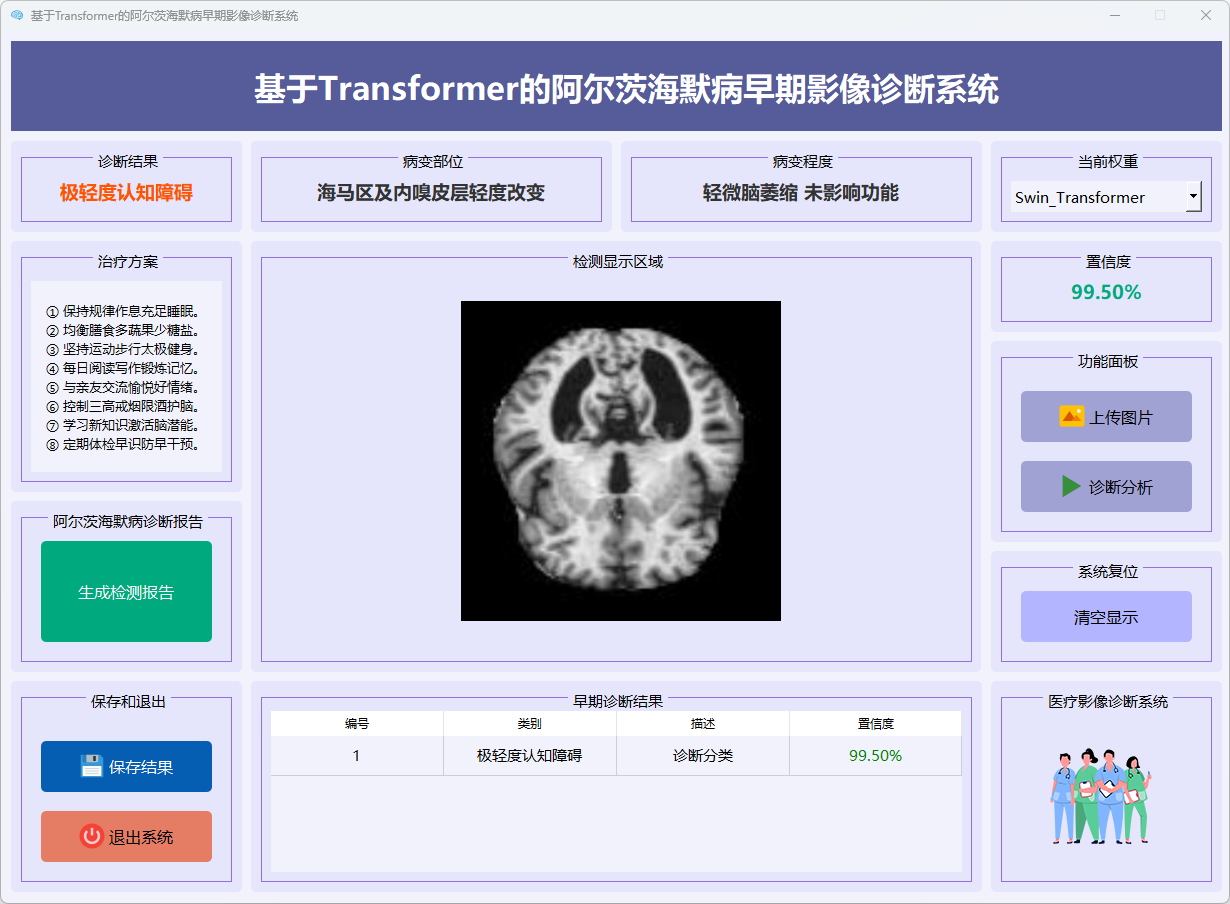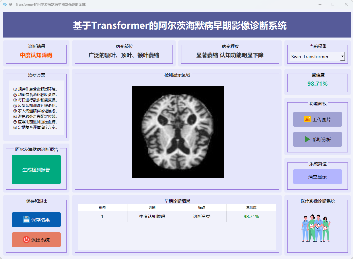 该系统采用了Swin-Transformer模型,结合了卷积神经网络(CNN)与Transformer的优势,通过自注意力机制和位移窗口技术,有效处理医学影像中的局部与全局信息。这种方法使得系统在处理医学影像时具有较高的精度和鲁棒性,能够从大规模数据中提取细节信息,并提高计算效率。Swin-Transformer的创新结构,特别是在图像特征提取和分类任务中的应用,展示了其在阿尔茨海默病早期诊断中的优势。
