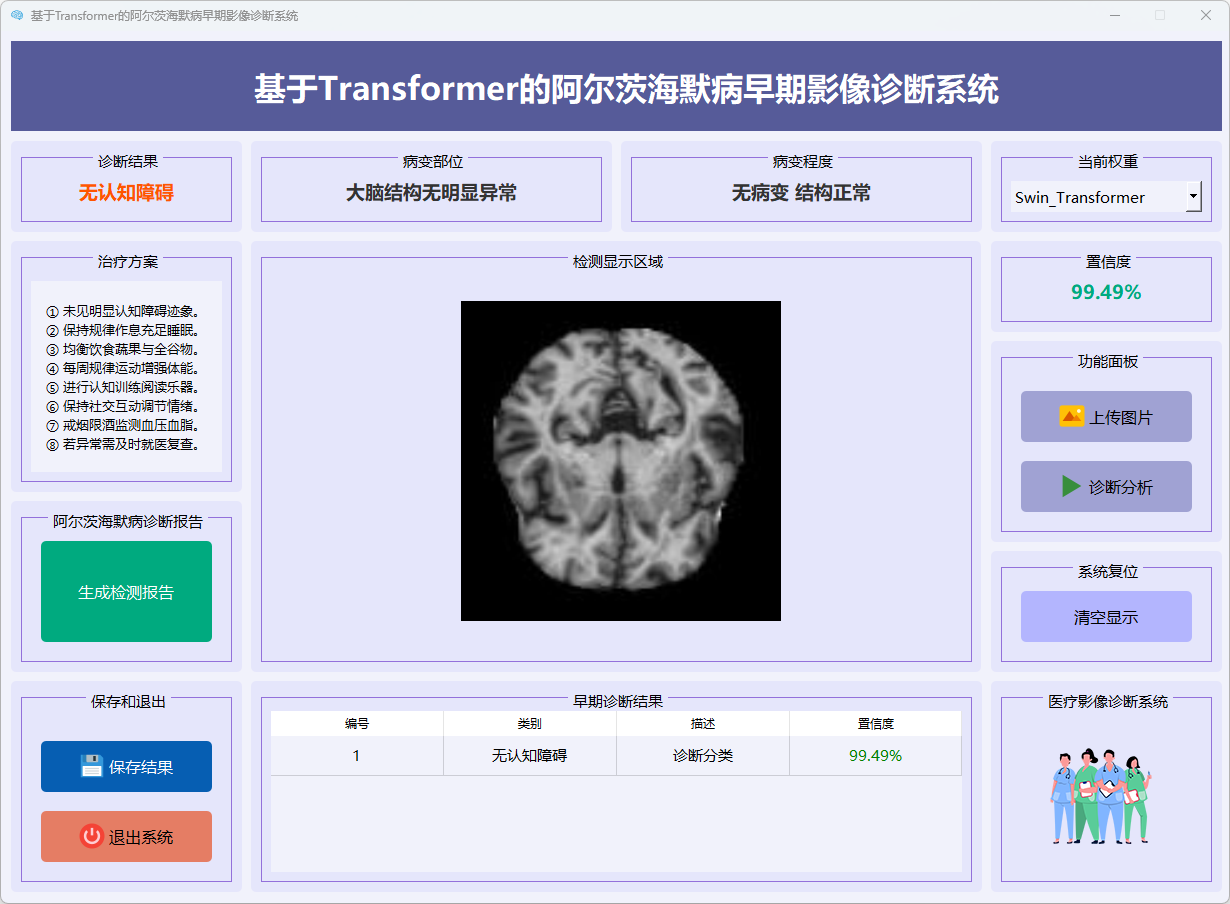 随着阿尔茨海默病(AD)对全球老年人群体健康构成日益严峻的挑战,早期诊断变得愈加重要。传统的阿尔茨海默病诊断方法依赖于临床症状和神经心理学评估,导致早期诊断存在较大延误。本文提出了一种基于Swin-Transformer的阿尔茨海默病早期影像诊断系统,旨在利用脑MRI图像对患者的认知状态进行自动化分类,从而实现精准识别轻度认知障碍(MCI)、极轻度认知障碍、无认知障碍和中度认知障碍等不同认知状态。