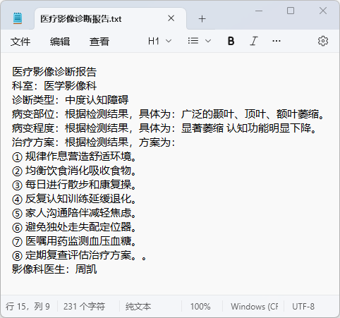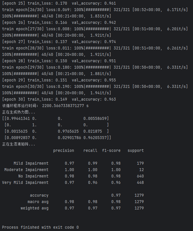 该图展示了模型在各类认知障碍状态下的性能评估,准确率为97%。精确率、召回率和F1分数均接近1,特别是在“中度认知障碍”类别中达到100%。其他类别如“轻度认知障碍”和“无认知障碍”也表现优异,精确率和召回率超过0.98,F1分数为0.98,表明模型能准确识别各类认知障碍并具有较强的召回能力。总体而言,模型在分类任务中展现了卓越性能和良好泛化能力。