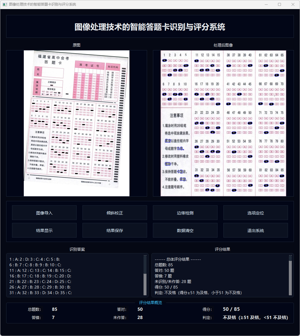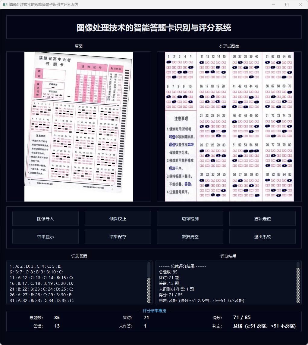 实验结果表明,系统能够快速、准确地识别答题卡中的填涂答案,识别精度较高,且处理速度满足实际需求。该系统为传统的人工批改提供了高效、准确的替代方案,具有较高的实用价值。
