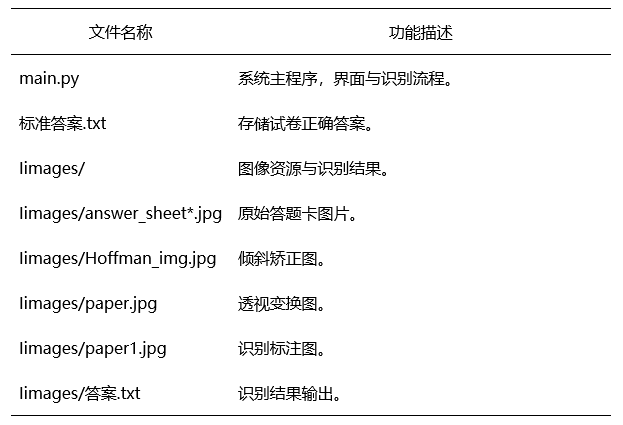 该系统的主要技术包括霍夫曼变换、Canny边缘检测、透视变换以及连通域分析等。首先,系统使用霍夫曼变换对原始答题卡图像进行旋转矫正,确保图像正向排列。接着,采用Canny边缘检测算法提取图像中的边缘信息,并通过透视变换将图像校正为标准化的答题卡格式。然后,利用阈值分割与连通域分析方法定位答题卡中的选项区域,最后通过几何信息识别每个选项的答案。