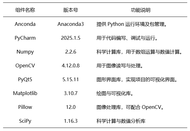 对本实验所需的各类软件及工具的基本信息进行了清晰汇总。